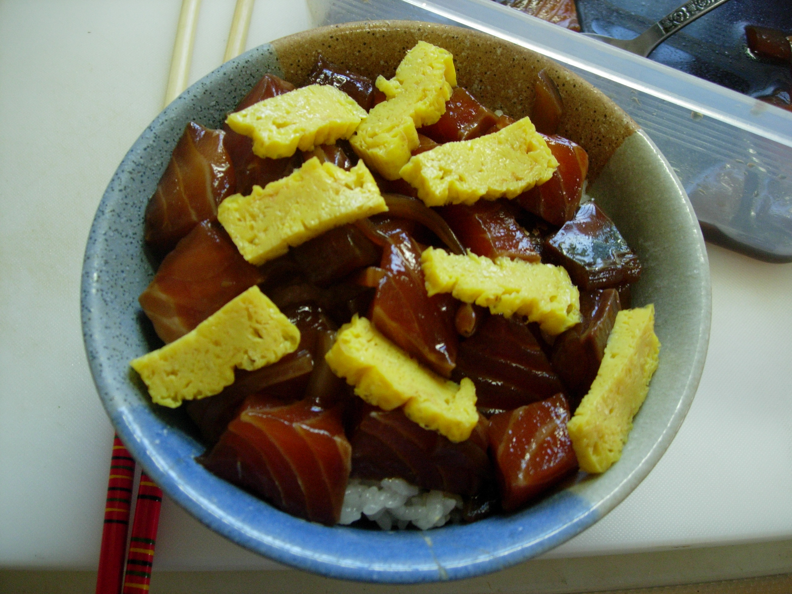 The photo above was a donburi that Shinji made with maguro (tuna) marinated in soy sauce, mirin, and sake and garnished with tamagoyaki.