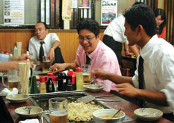 While Osaka may be famous for okonomiyaki, Tokyo has its own, much messier version, monjayaki. After getting out of the station at Tsukishima, follow your nose to “Monja Dori,” where it looks like time stopped about 25 years ago (left). The secret to enjoying monjayaki is to have your server help you make the first one or two until you get the hang of it. If you can manage to make it thin enough, you’ll find that the pari pari crispy bits put okonomiyaki to shame. Suggested toppings include cheese, mentaiko and mochi.