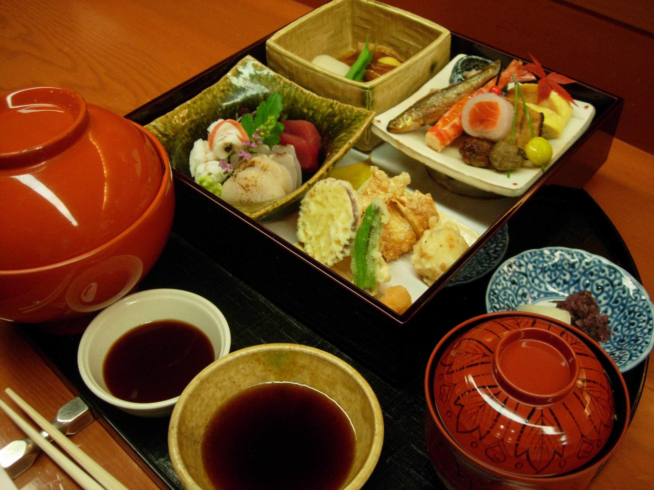 Here is the Yukari bento, a large meal, complete with tempura, sashimi, a simmered dish, and more.