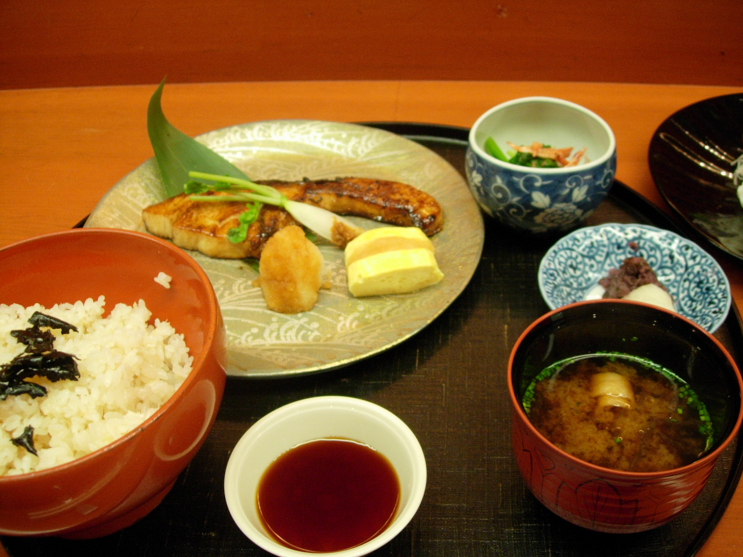 This is a basic lunch of a grilled fish, side dish, pickles, rice, and miso soup.