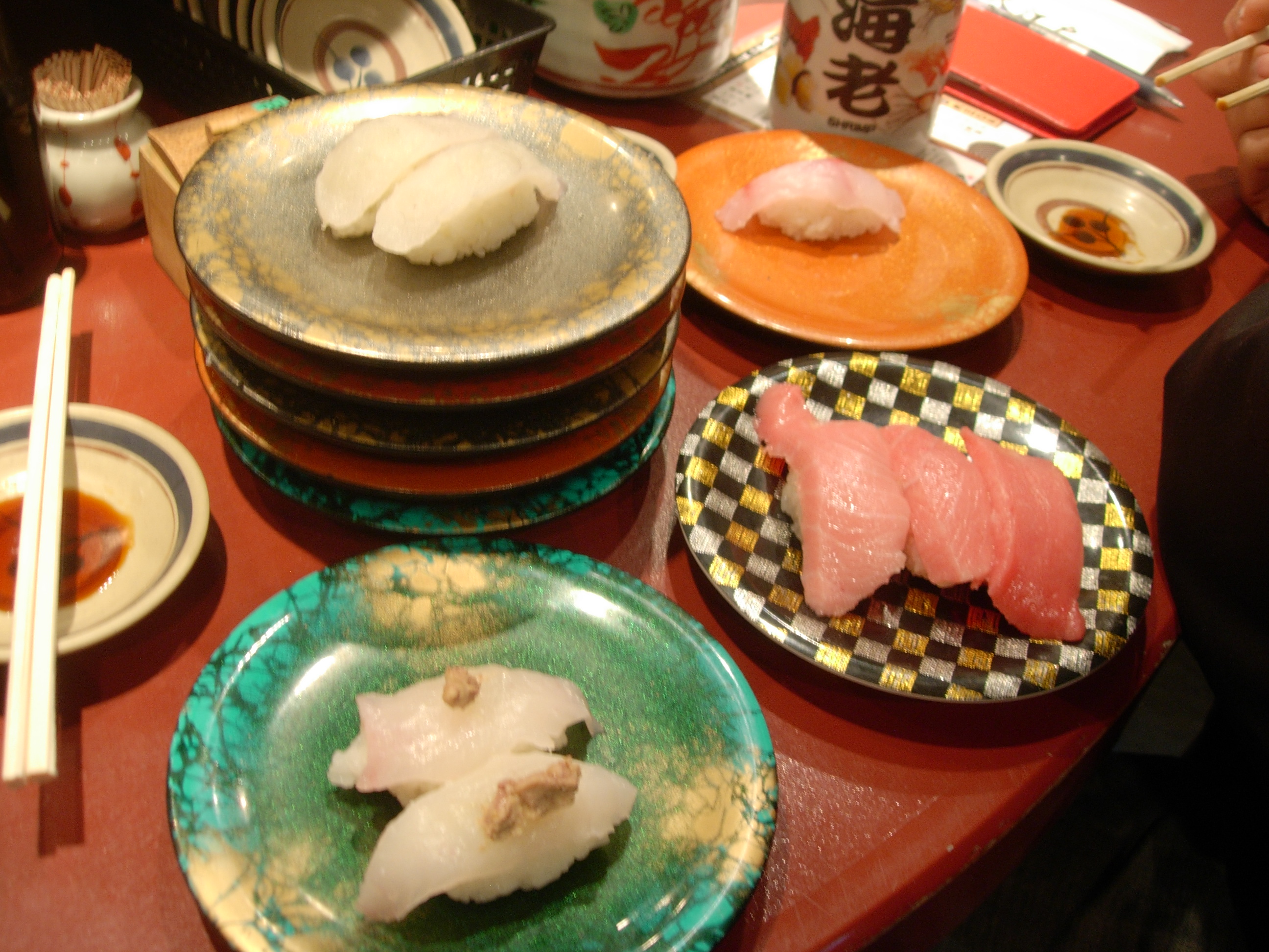 As a fishmonger, Shinji is always craving sushi. There are many ranks of restaurants, even within the kaitenzushi (revolving sushi). Ooedo Kaitenzushi came highly recommended for its variety of fresh fish at a reasonable price. Ooedo has several locations throughout the city. This one is near Okachimashi, just south of Ueno station and near the boisterous Ameyoko market.