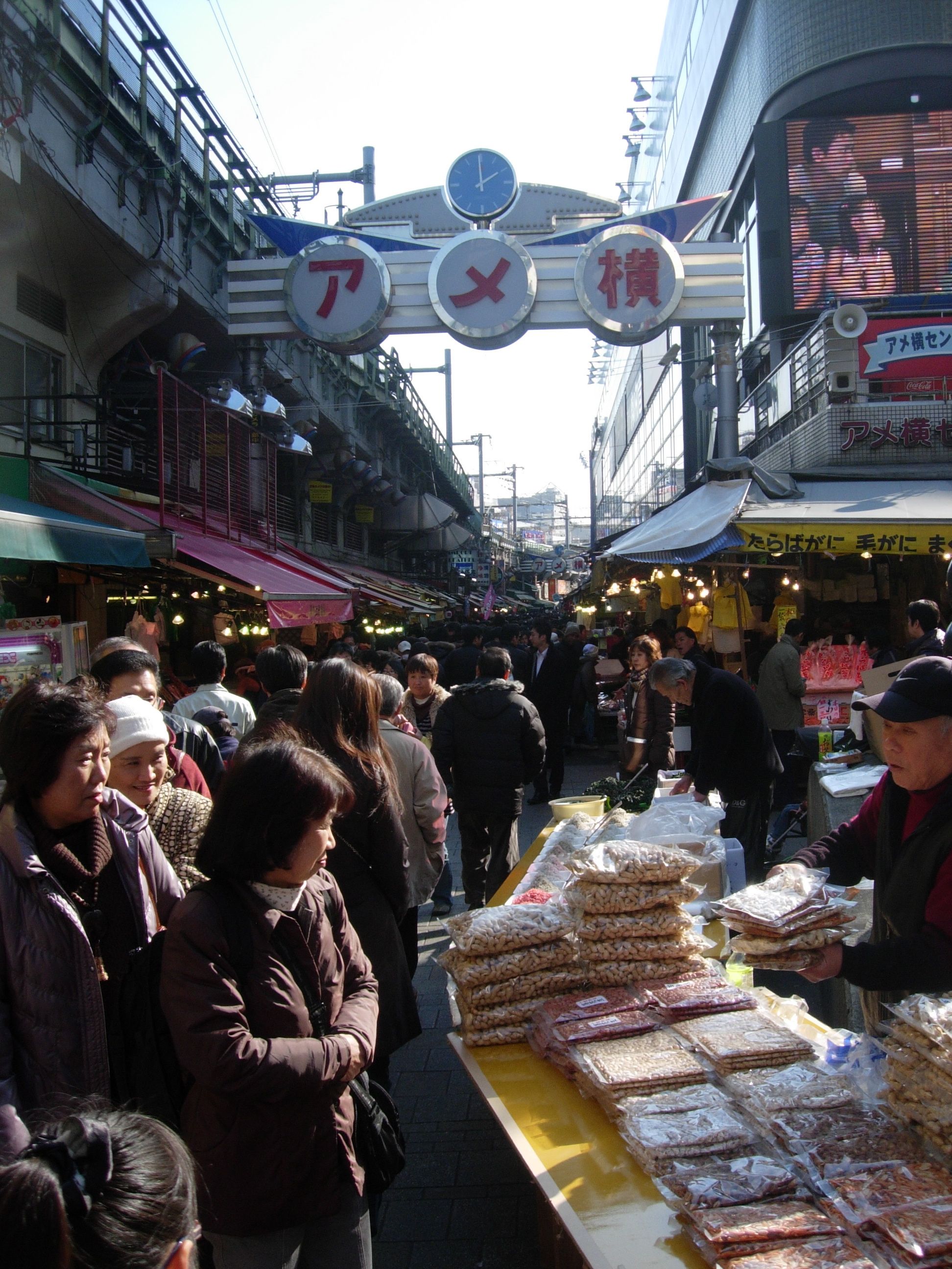 Located under the Yamanote line train tracks at Ueno station heading south to Okachimachi station on the way to Akihabara, the electronics town, is Ameyoko, a boisterous, lively outdoor market. Not nearly as impressive as Tsukiji Fish Market, but this is open on seven days a week, which is a good alternative if Tsukiji is closed. Ameyoko got its name from “ame-ya” as there were a lot of candy (ame) shops there before, and from “America-ya” as products from America was sold there. Yoko means next to and the shopping arcade is next to the train line, part of it actually under the tracks.