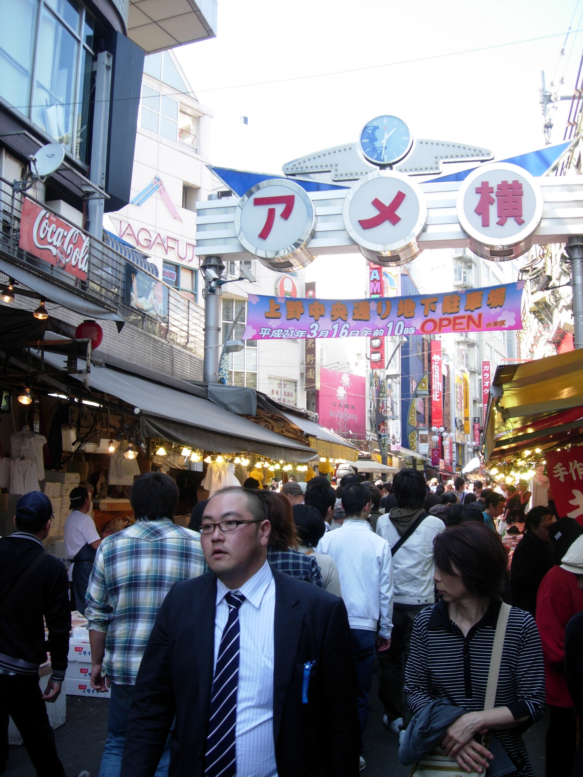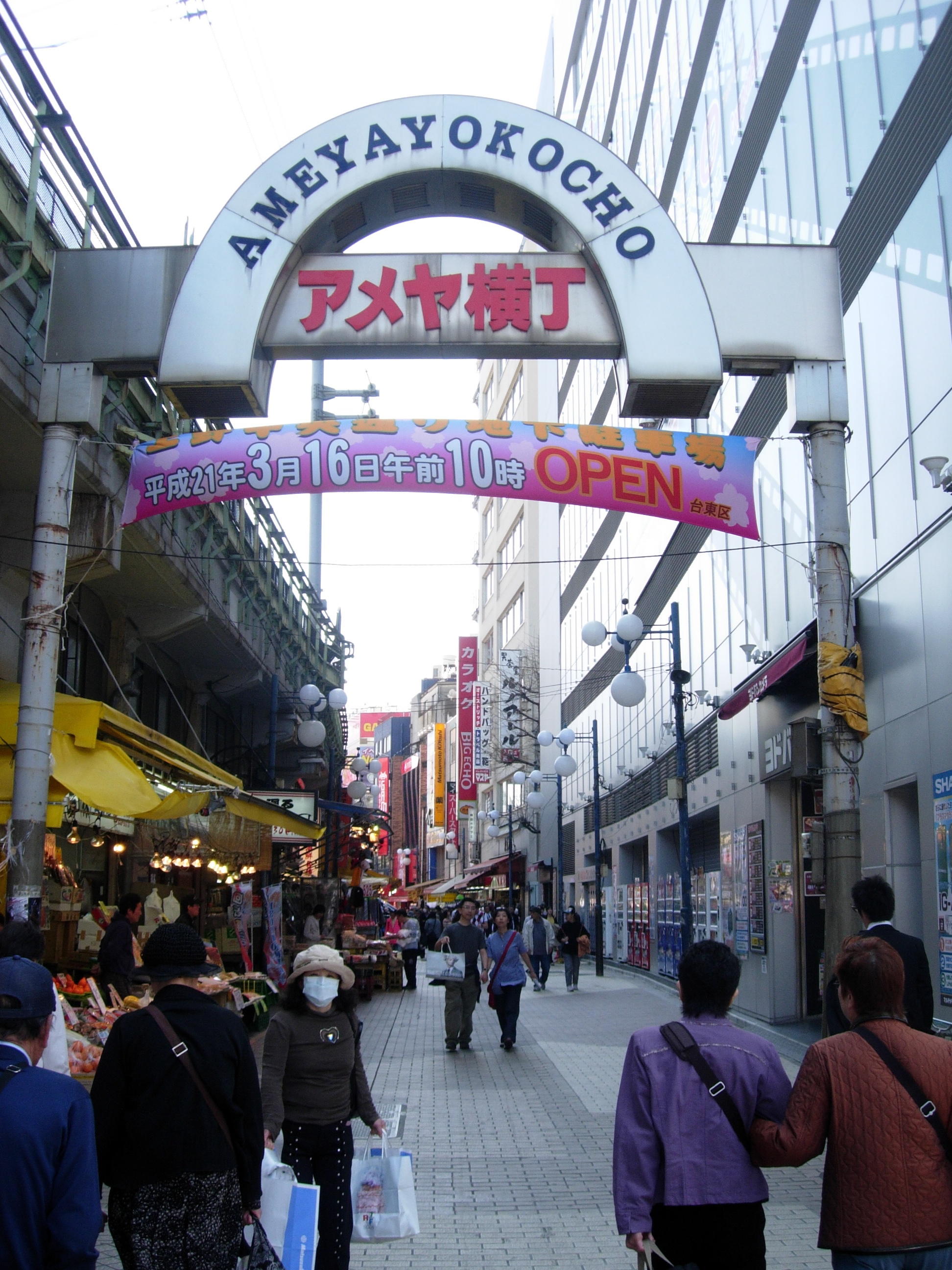 Located under the Yamanote line train tracks at Ueno station heading south to Okachimachi station on the way to Akihabara, the electronics town, is Ameyoko, a boisterous, lively outdoor market. Not nearly as impressive as Tsukiji Fish Market, but this is open on seven days a week, which is a good alternative if Tsukiji is closed. Ameyoko got its name from “ame-ya” as there were a lot of candy (ame) shops there before, and from “America-ya” as products from America was sold there. Yoko means next to and the shopping arcade is next to the train line, part of it actually under the tracks.