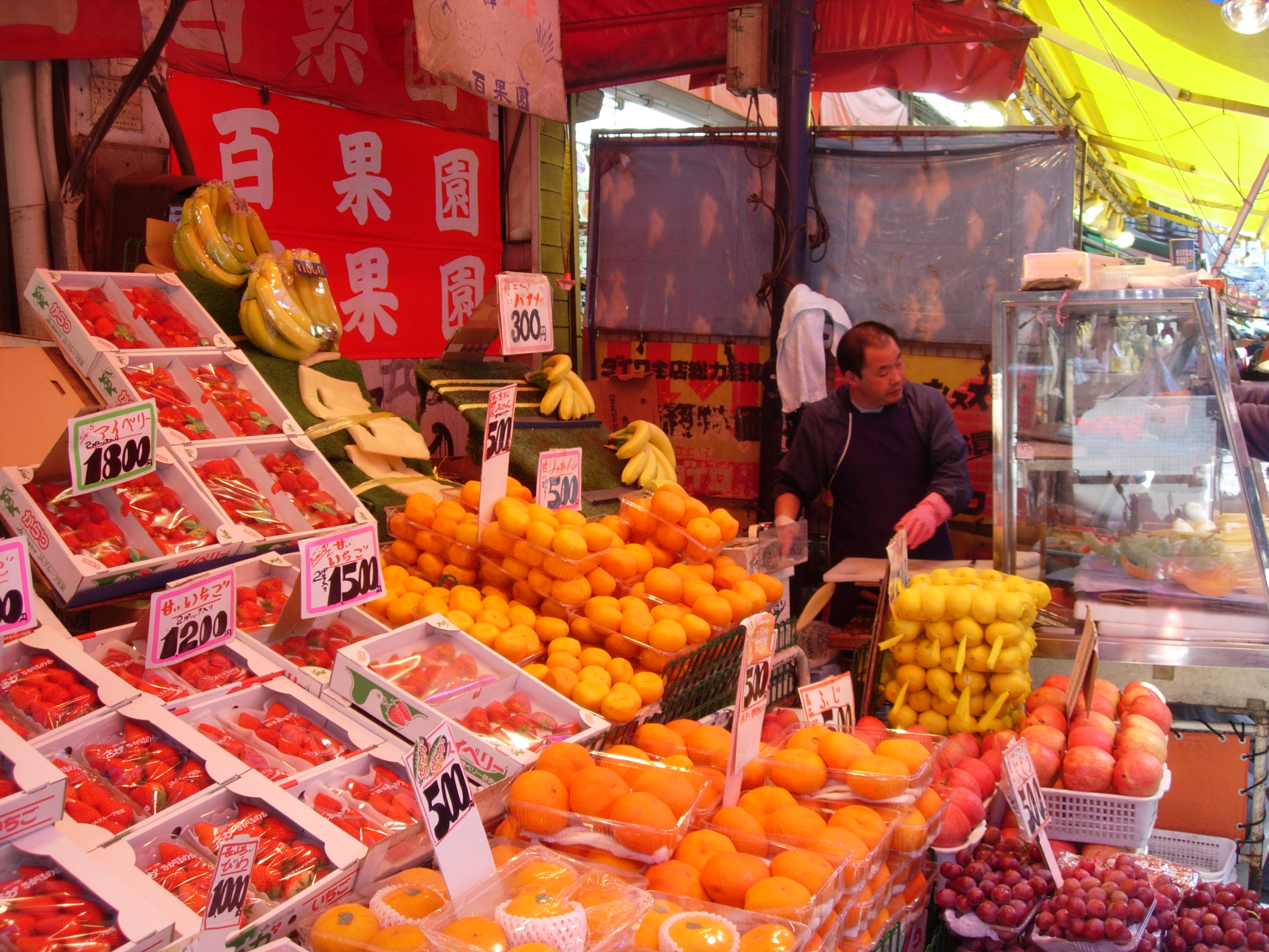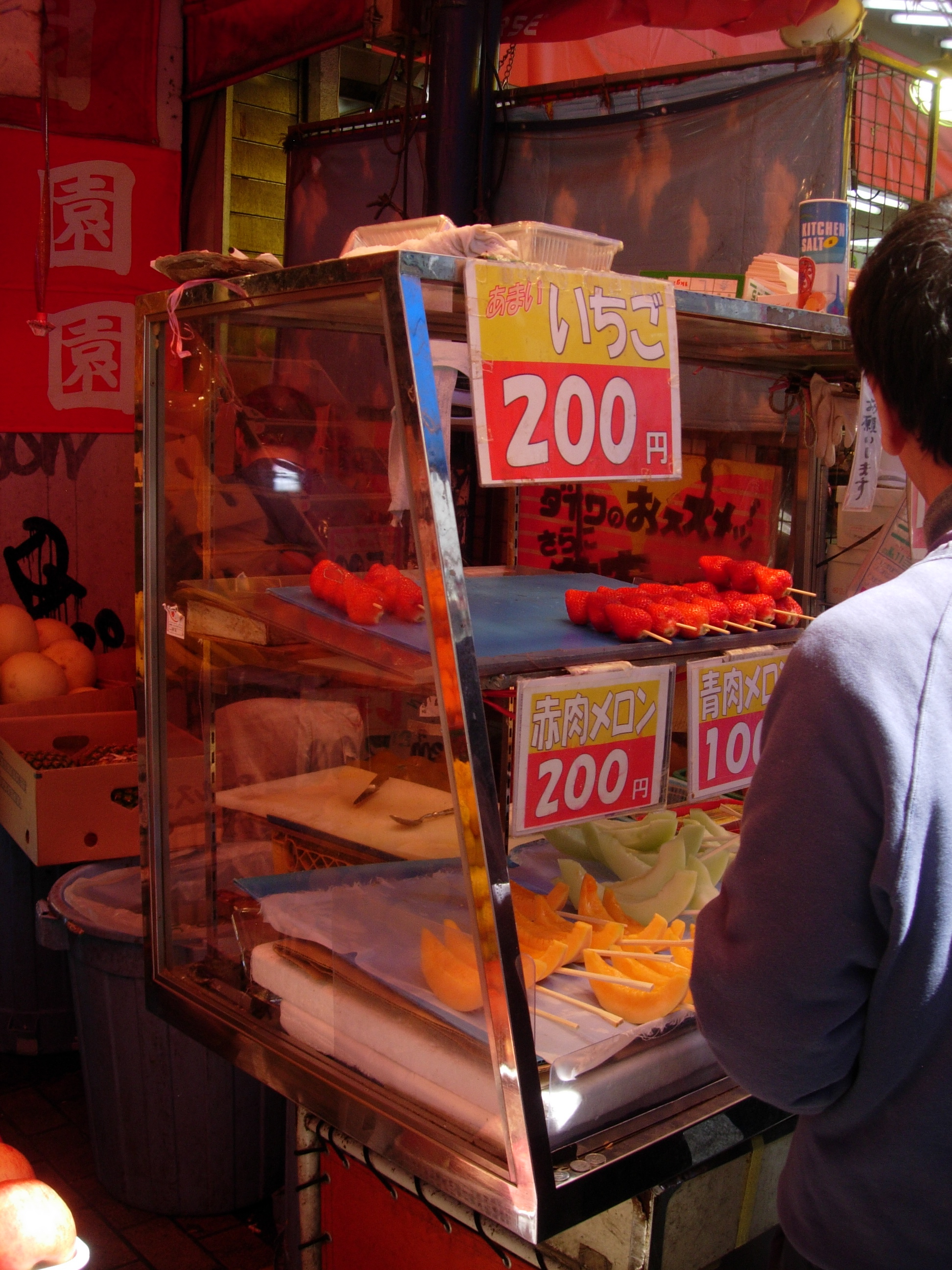 This fruit shop sells whole fruits boxed for gift-giving, however they are most famous for their seasonal fresh fruits skewered on waribashi (disposable chopsticks) like strawberries, pineapple and melon. The fresh fruits are juicy and a refreshing, healthful snack.