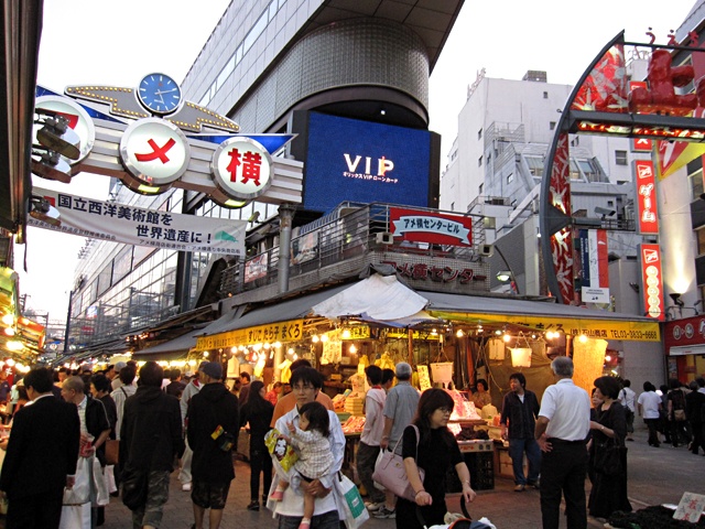 The fish stall at the base of the building is Ishiyama Shoten. The large building in the center is the Ameyoko Center Building.