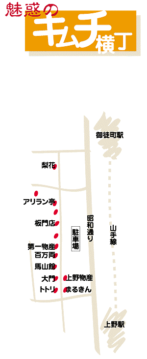 Even though the map is in Japanese, it will give you an idea of the number of shops in Kimchi Yokocho and where they are located.