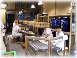 Popular round sembei are toasted until a golden caramel color and then dipped into a soy sauce. Only one style is made, shoyu (soy sauce). Uruchimai (rice) cakes are dried for 3 days and then grilled for five minutes. Each day they grill 4,000, winter takes longer to grill. Often the men are in white t-shirts and thin, white cotton pants. “Yakitate” osembei have just been toasted and are hot and the best way to try them. Iriya have been toasting rice crackers since 1914.