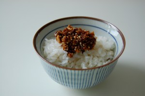 The oil based condiment is made with freeze-dried soy sauce flakes, fried garlic, fried onions, sesame seeds, almonds, and more spices. Over rice it was good but we found it a bit oily. The bottle suggests putting it over boiled vegetables or stir-fries. We also had it over steamed greens which was better than the rice. However, our favorite is over sake-steamed fish. The contrast of the crunchy condiment and the juicy, flakey cod was perfect. Seasoning also a perfect match.