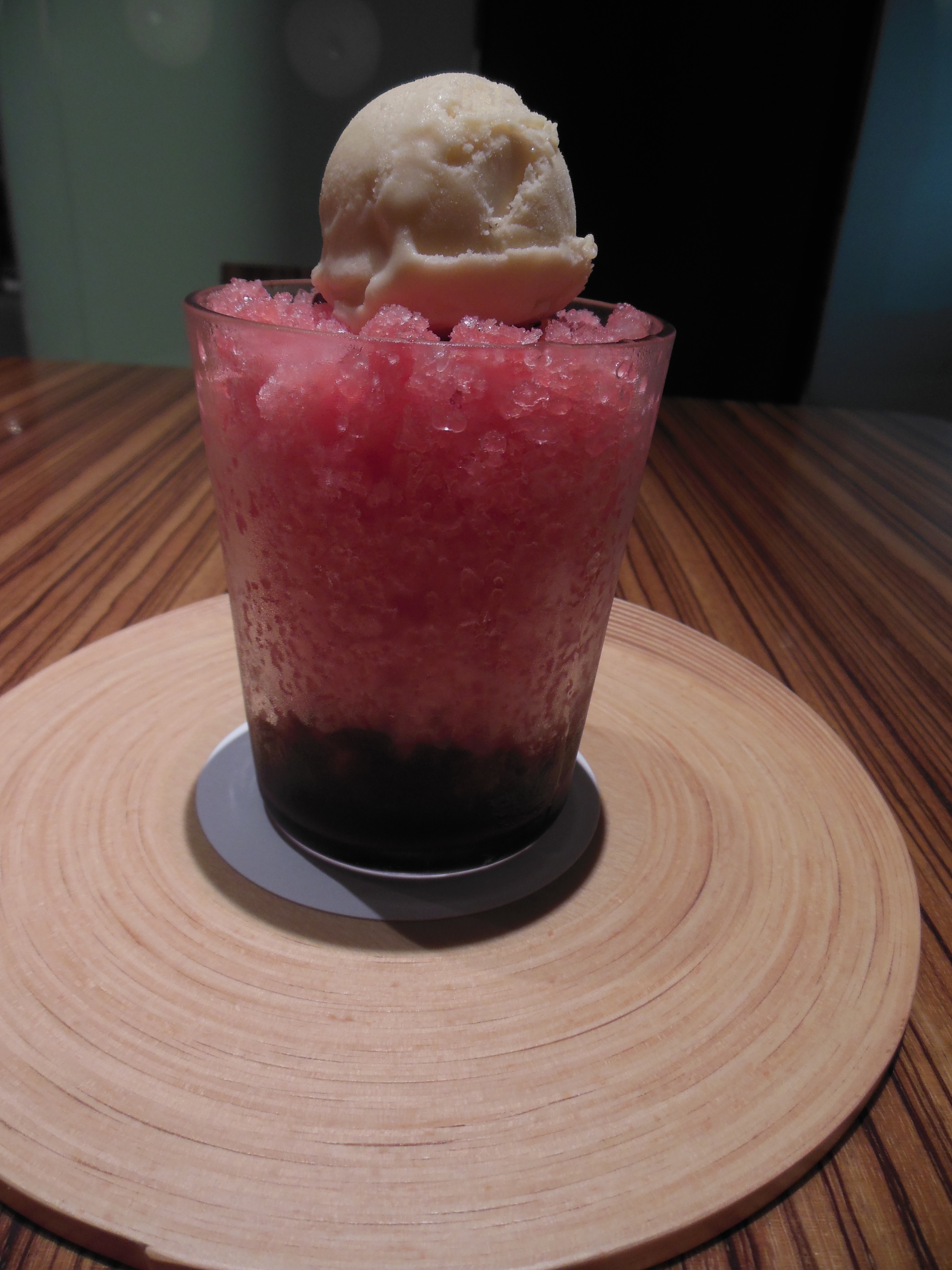 The bottom of the glass has a not too sweet kuromitsu (brown sugar) and rum syrup. It was a little thick so I am guessing that it had a little bit of Toraya’s famous An Paste (a creamy azuki paste that I love on toast). On top of the watermelon ice was some azuki beans as well as some soy milk ice cream. This is part of a summer promotion and is only available in August.