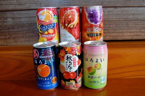 Front L to R: Suntory Yorohoi Hiyashi Anzu, Suntory Aki (fall) Ringo (apple) Chuhai, Suntory Yorohoi Umeshu Soda