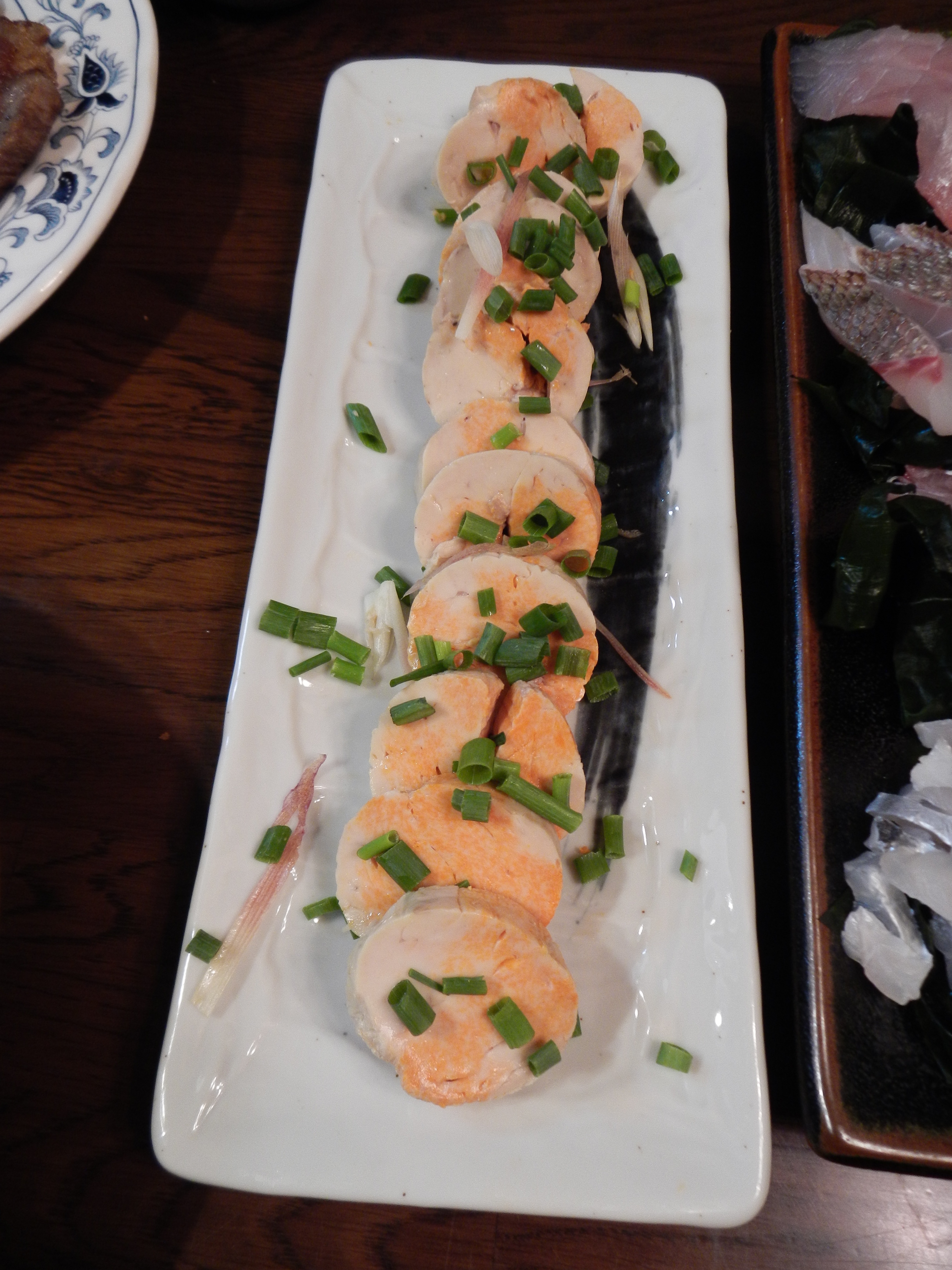 The photo above is of monkfish liver that we made at home. The liver is often sold at supermarkets this time of year. Simply marinate in a bit of salt and sake, roll up in plastic wrap and then foil, steam until cooked through, then chill and slice. Serve with a citrusy soy ponzu and a sprinkle of shichimi (seven spice). Many Japanese gourmands call it the foie gras of the sea, albeit not as rich, so a delicate treat.