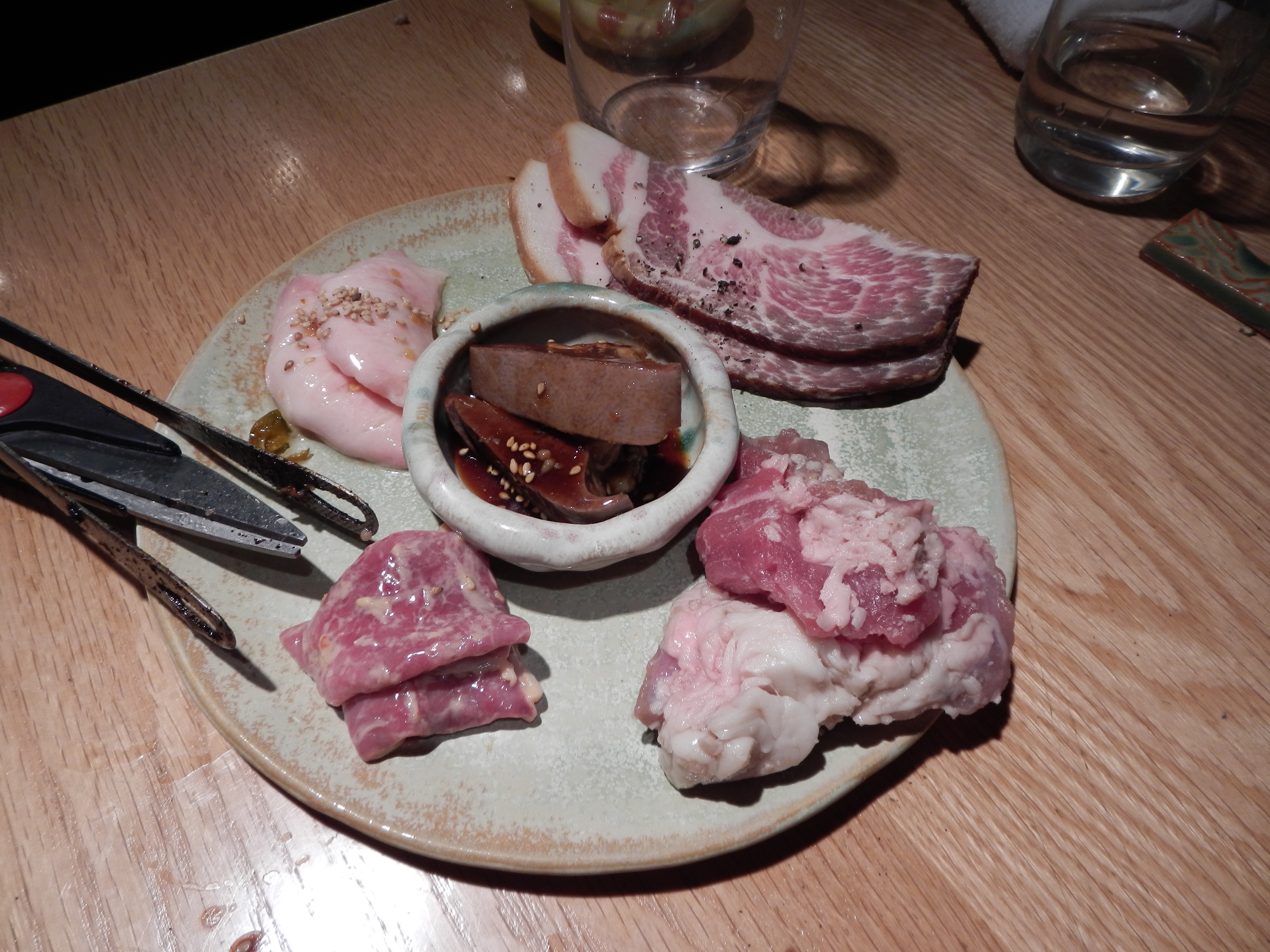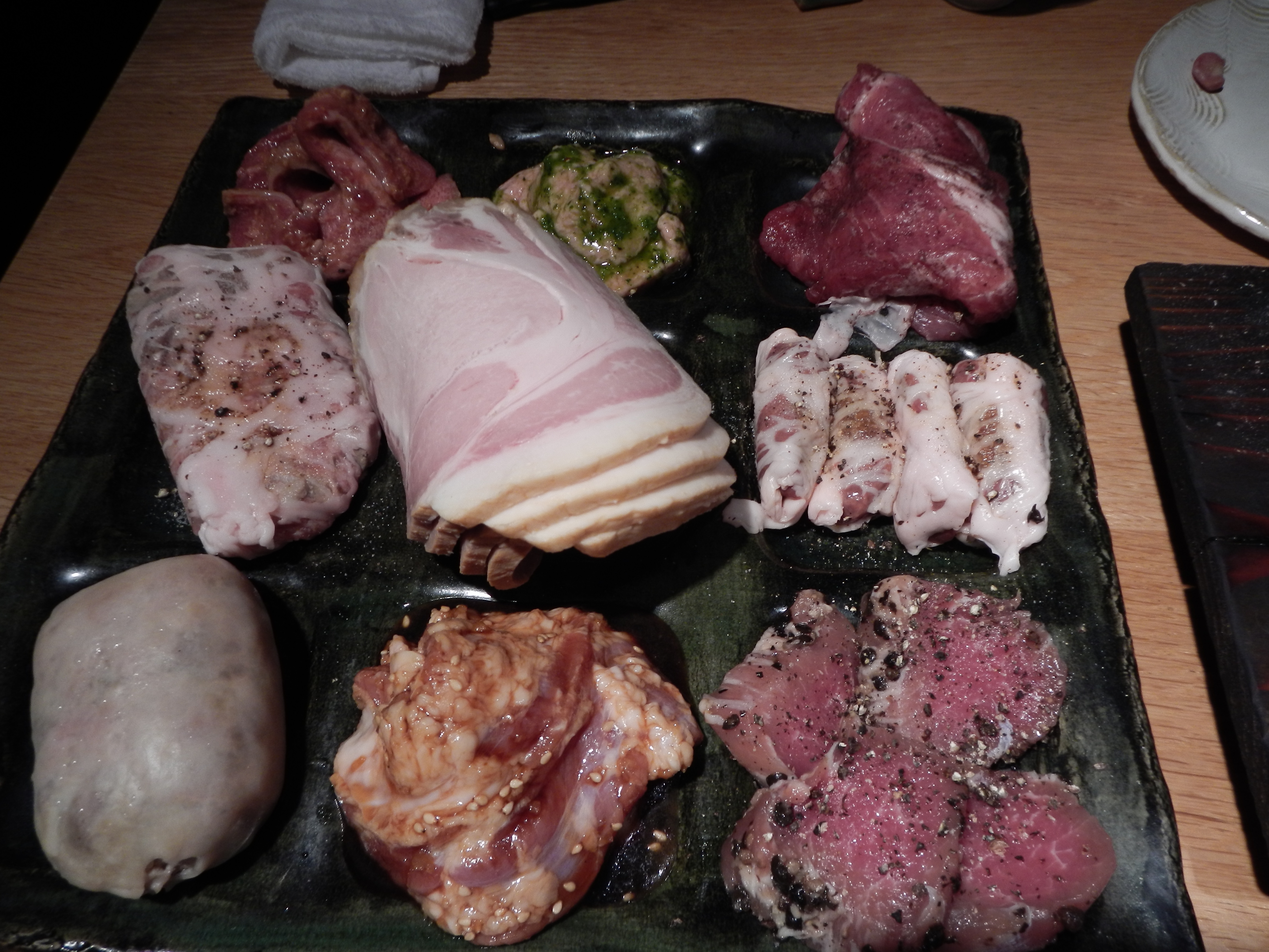 Harami with Shio Koji, Guts, Nodobue (vocal chords) with Fish Sauce, Pork Spleen, and Bacon
