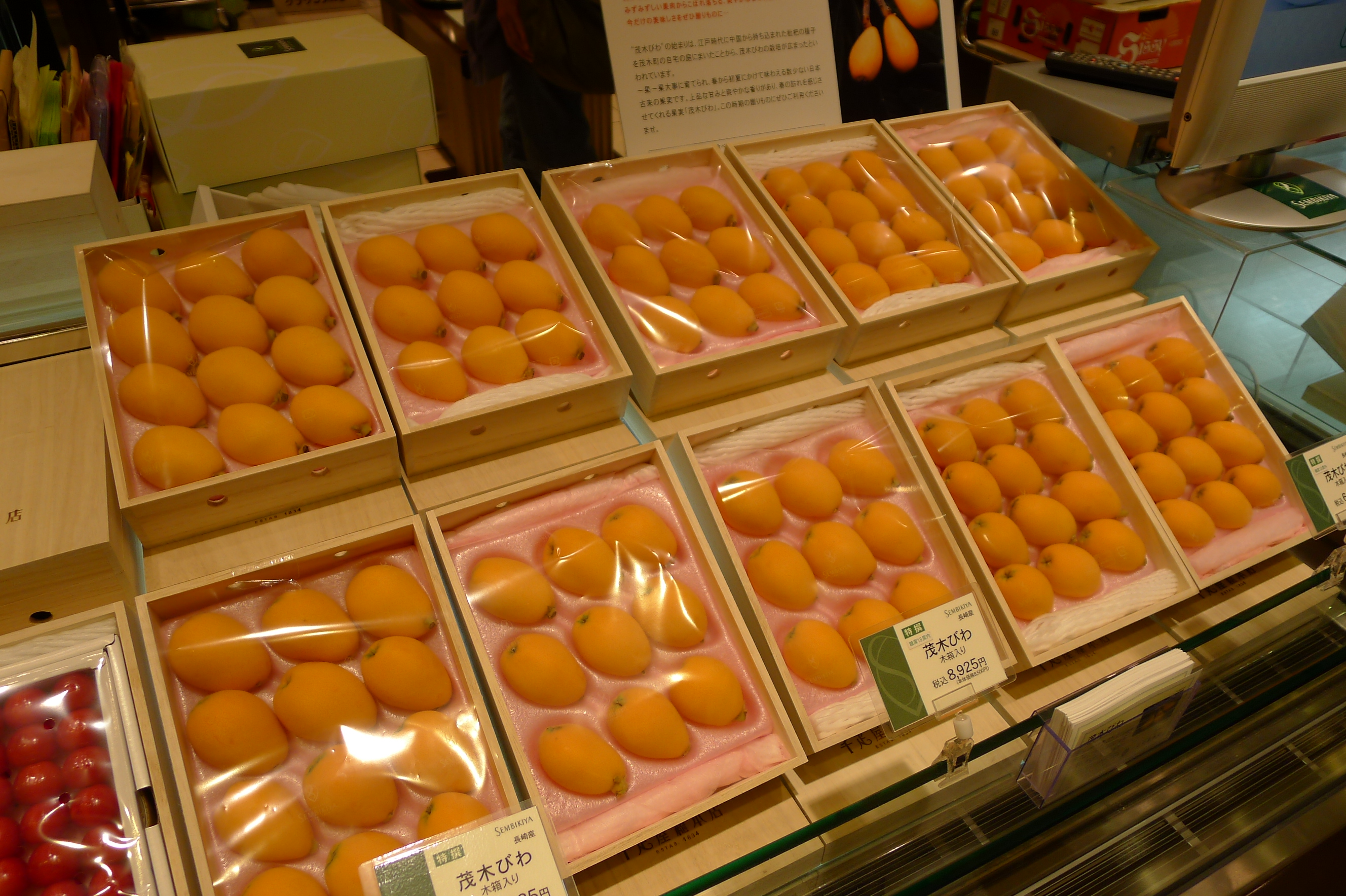 In this photo are Nagasaki biwa (loquats, Eriobotrya japonica), in season in the spring. These tangy and sweet fruit can be eaten fresh or simmered in a simple syrup. It is also lovely in a gelatin. 8,925 JPY per box.