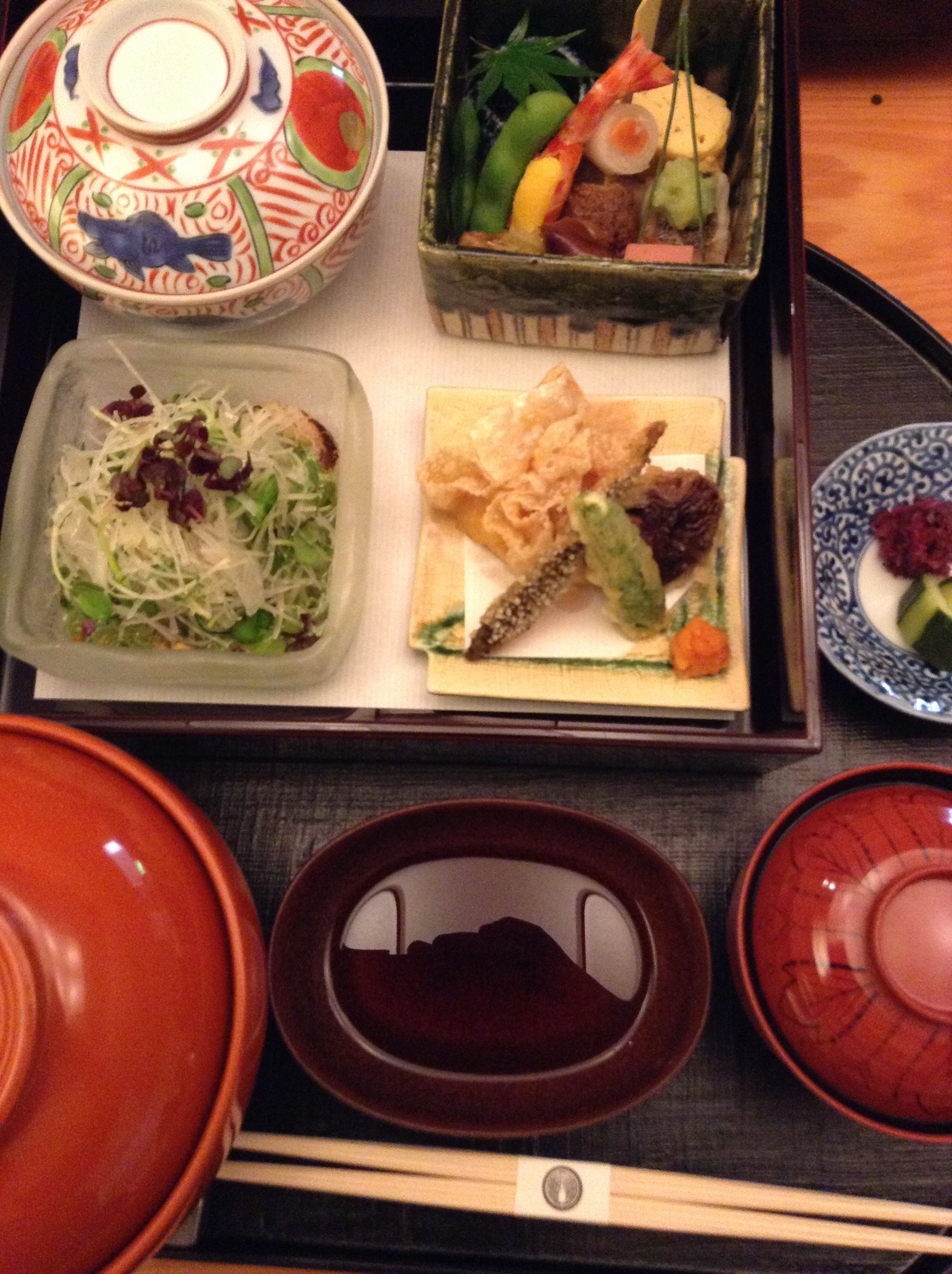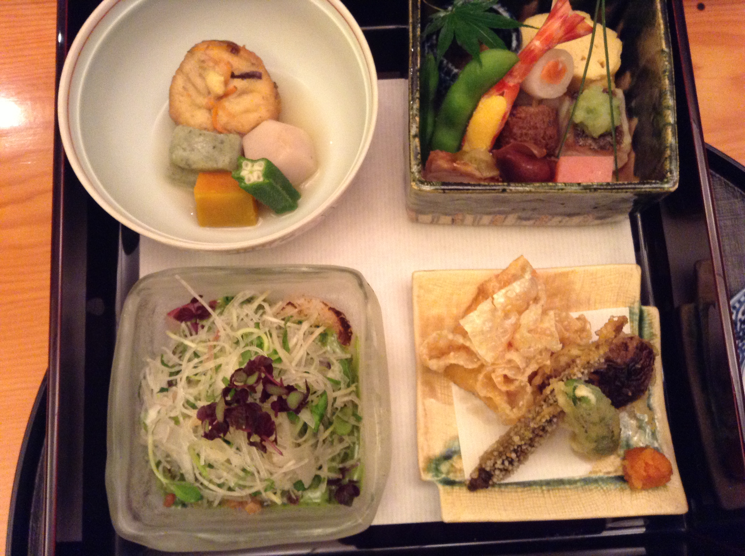 Top left is the simmered course with ganmodoki (deep-fried tofu) and nama fu, a lovely wheat gluten that is a treat as at our home we only have the dried version of fu which doesn’t have the chewy texture of nama fu.