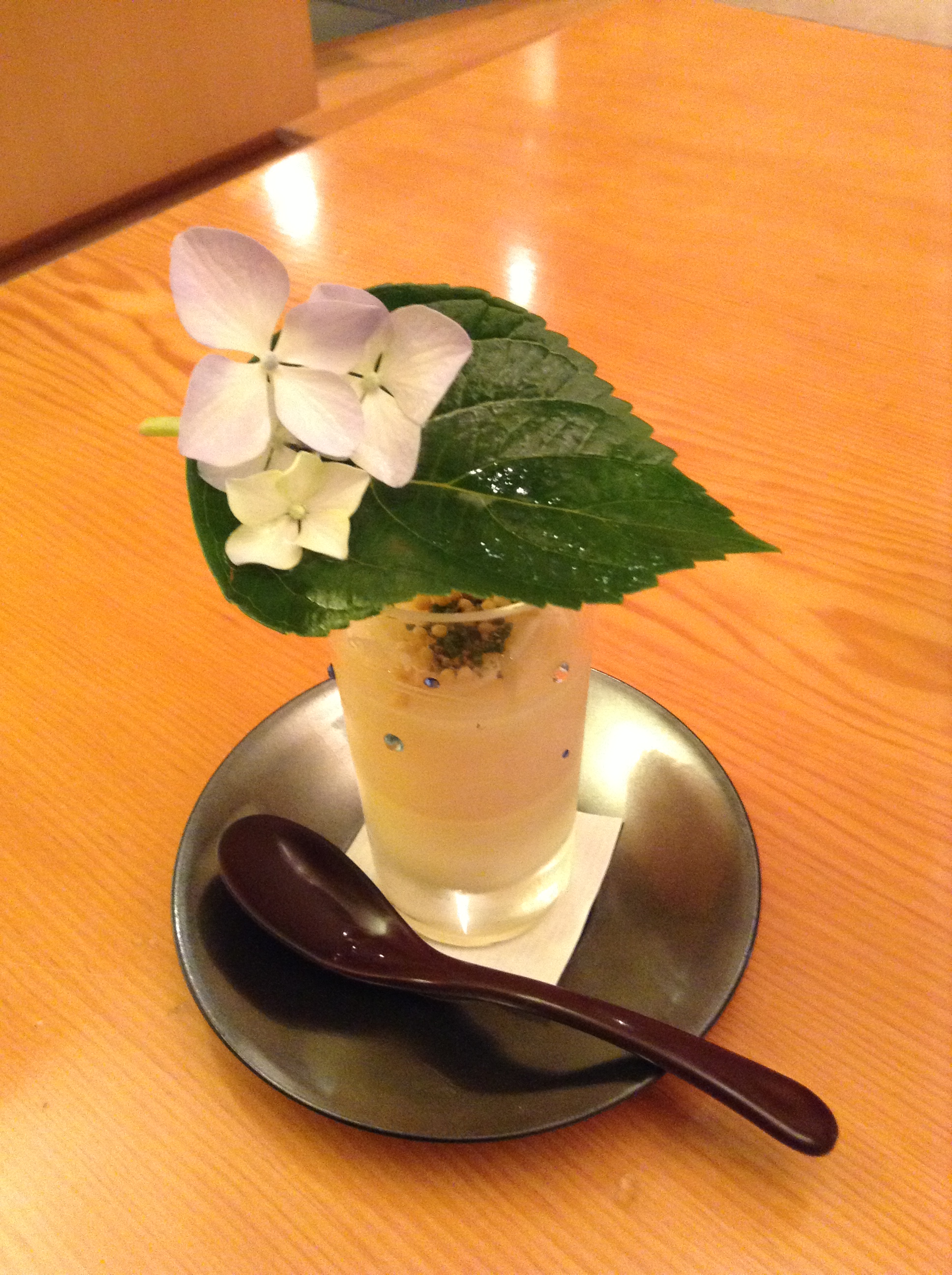 This lunch in early June starts with a chilled chawanmushi topped with a hydrangea flower picked from the small garden in front of the restaurant. Hydrangeas (ajisai) are blossoming all over Tokyo but it’s an unexpected treat when it is presented with your meal. A gentle reminder to the time of year.