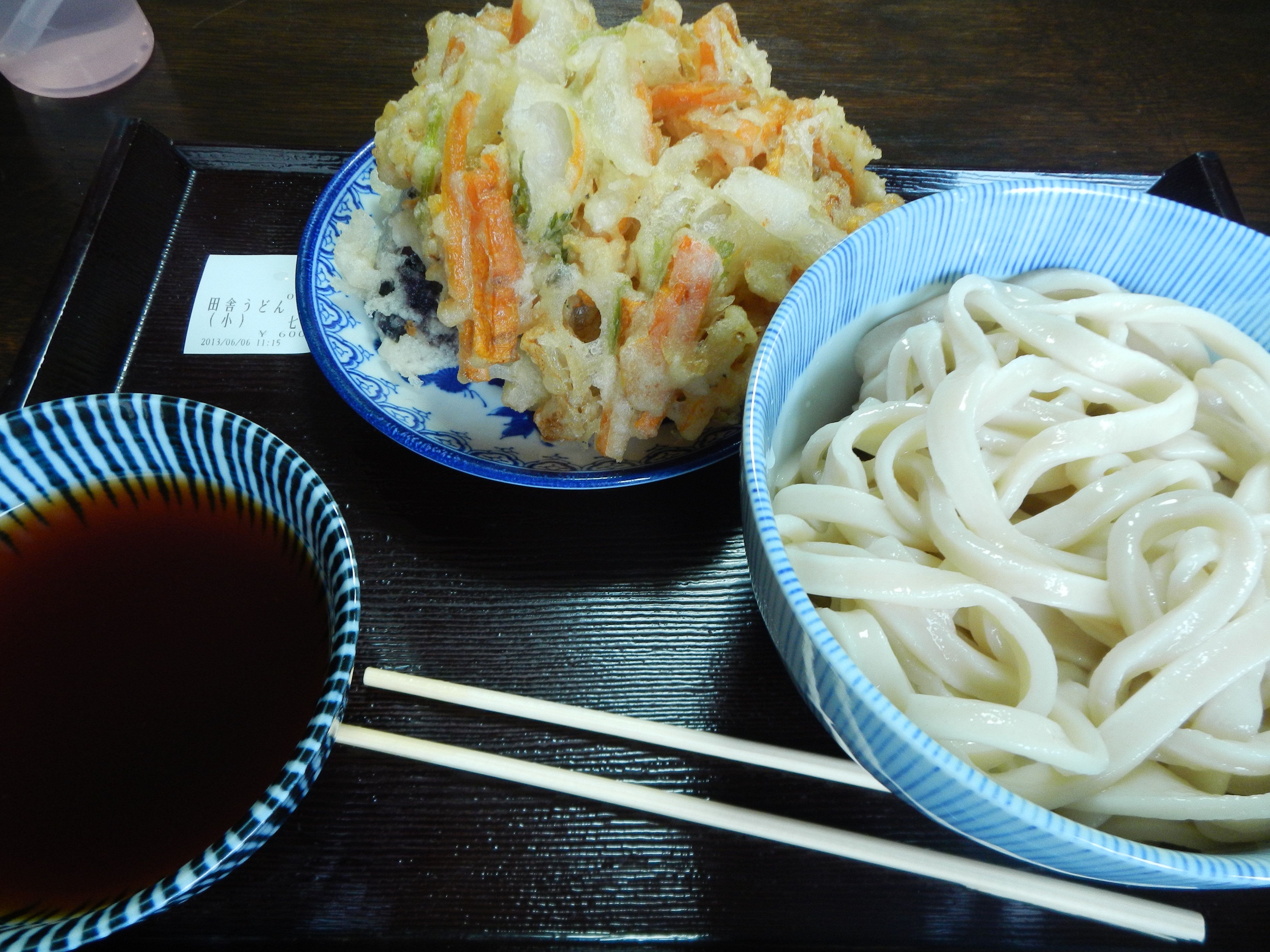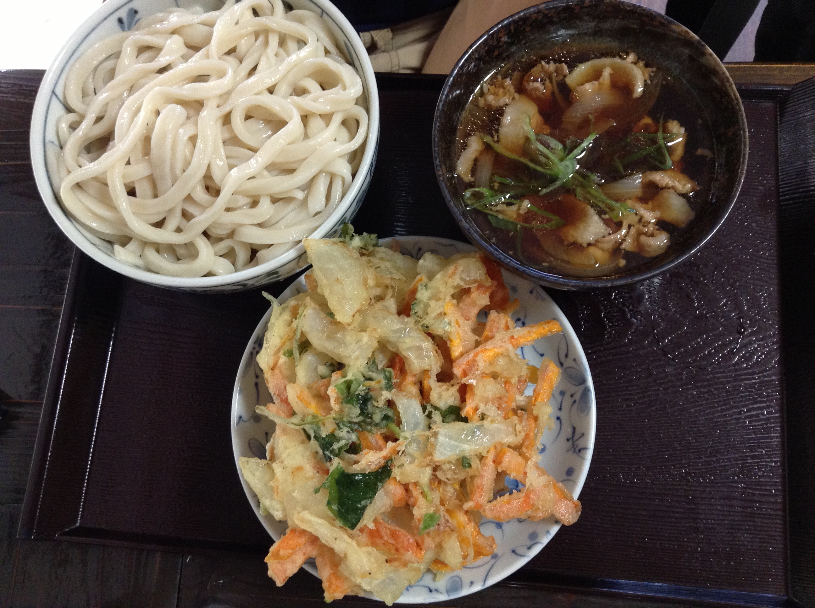 Creamy sesame dipping sauce with udon and kaki-agé tempura, a melange of vegetables chopped up and deep-fried in a cake, and kabocha tempura. This is the small “sho” portion, for a bargain 600 JPY.