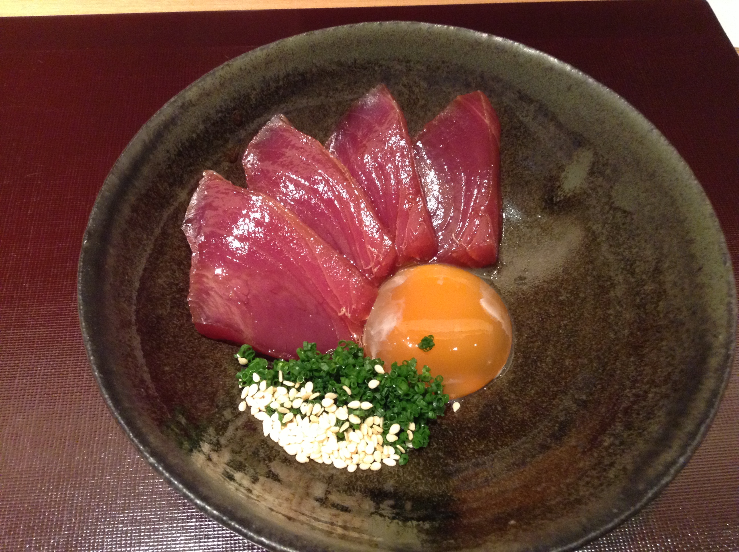 Katsuo-zuké, skipjack tuna marinated in soy sauce, is a dish we eat at home, but this was so much more upscale. The katsuo was marinated for a much shorter time than we do at home. Also, I loved the egg yolk that was marinated in dashi. There is a trick to get his texture but I don’t want to reveal too much.