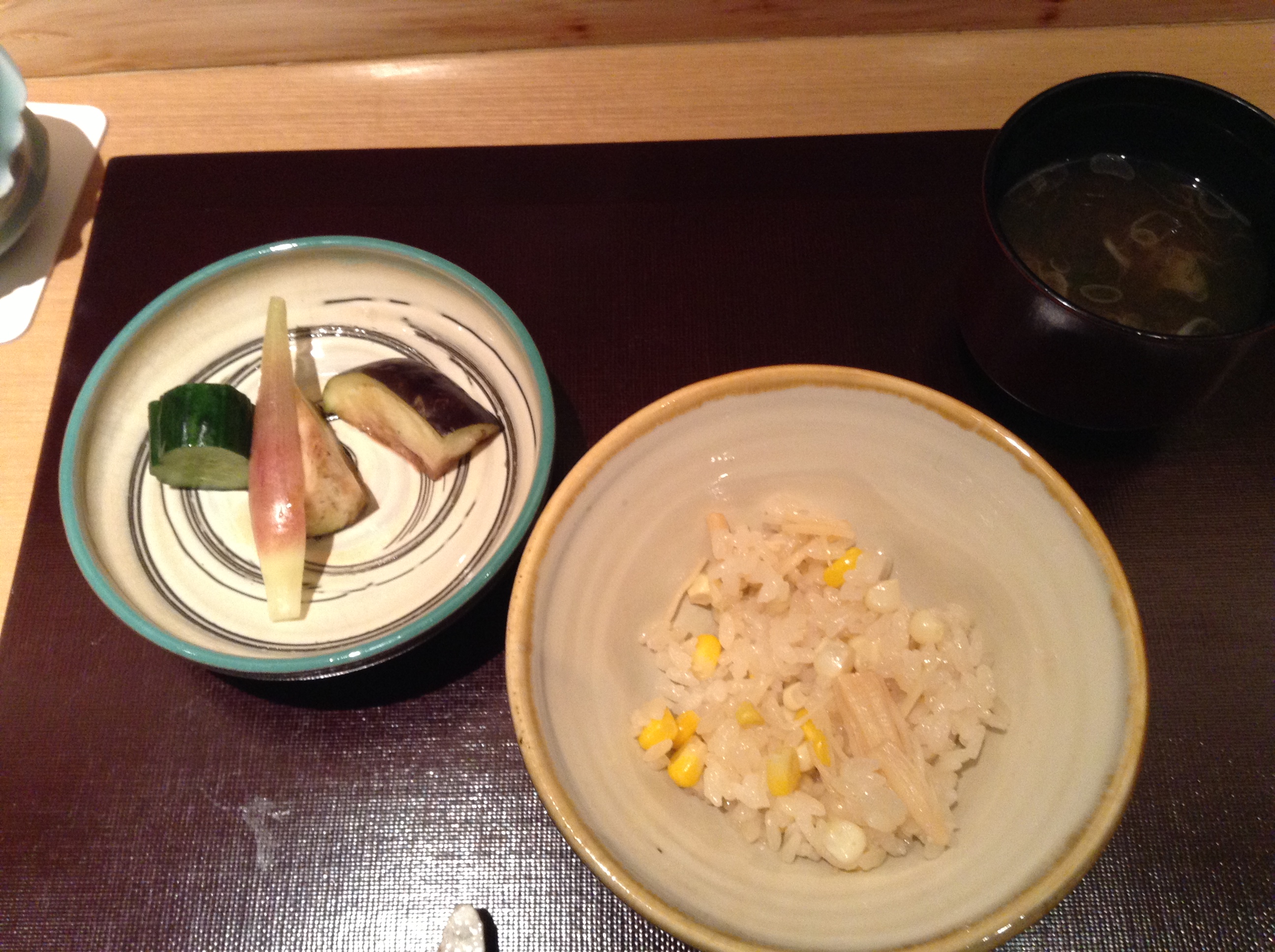 The rice course was amazing. Sweet corn and scallops cooked in dashi before adding to the rice pot to be cooked with the rice. I wish I could make this at home, and will definitely try.Den33I was getting full at the end of the meal so asked for a small serving of the rice. Chef Hasegawa made a rice ball for me to bring home to my husband. Very thoughtful. The rice was served with asazuké pickles made that morning and miso soup.