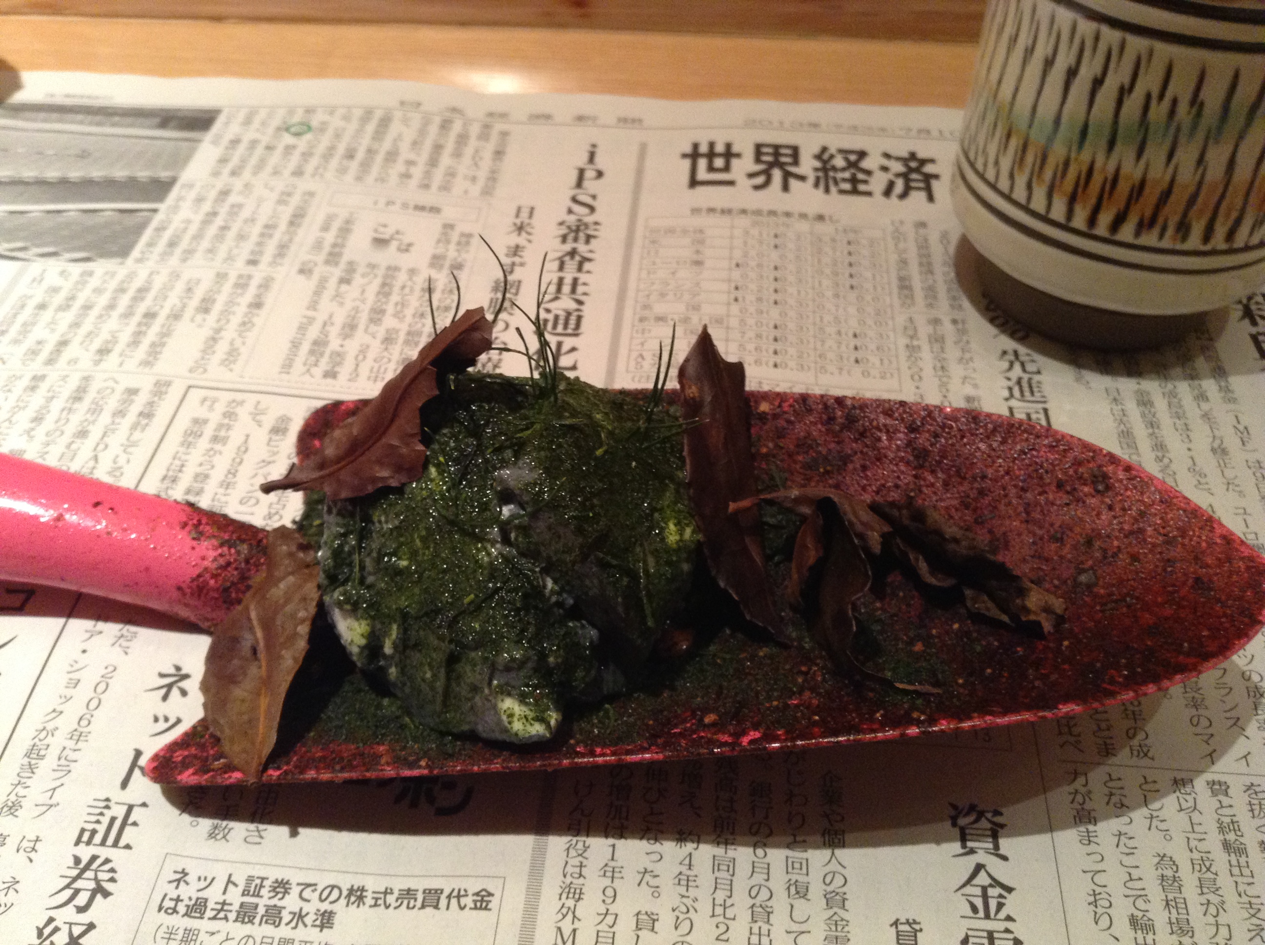 In the middle was liver mousse from the ayu. Very rich in flavor, but a light mousse. And the green cake on the bottom is a steamed bread made with tadé no ha (water pepper leaves) and rice flour. It is first steamed until cooked through and is light and fluffy. Chef Hasegawa then grills it under a direct flame to give the edges some crispy texture which is like the cooked edges of the ayu. Brilliant dish that can only be had here at Den.