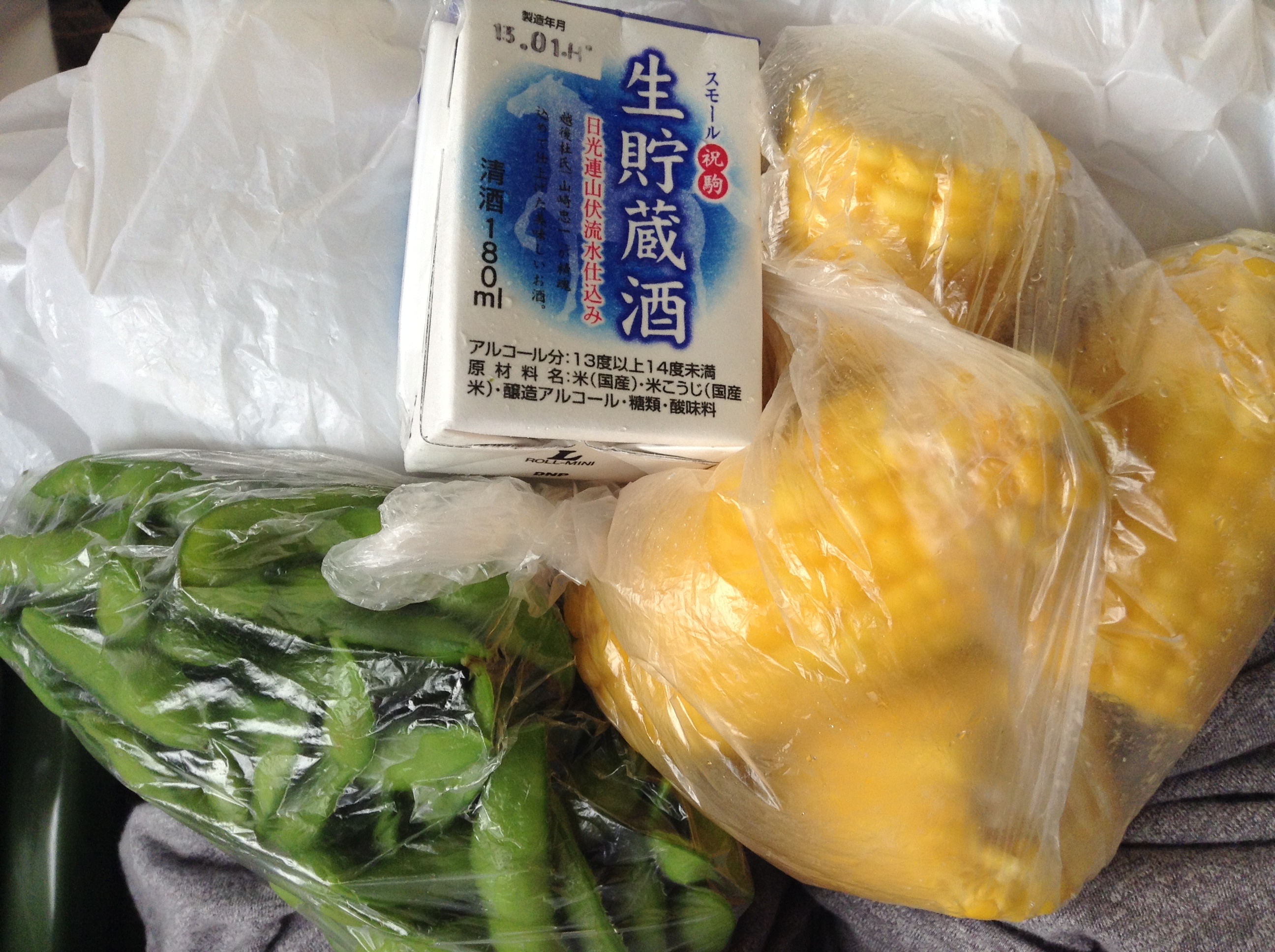 This was my favorite saké. The alcohol percentage, between 13 and 14%, is a bit on the lower side, perfect for the game. Some edamamé and sweet corn as well.
