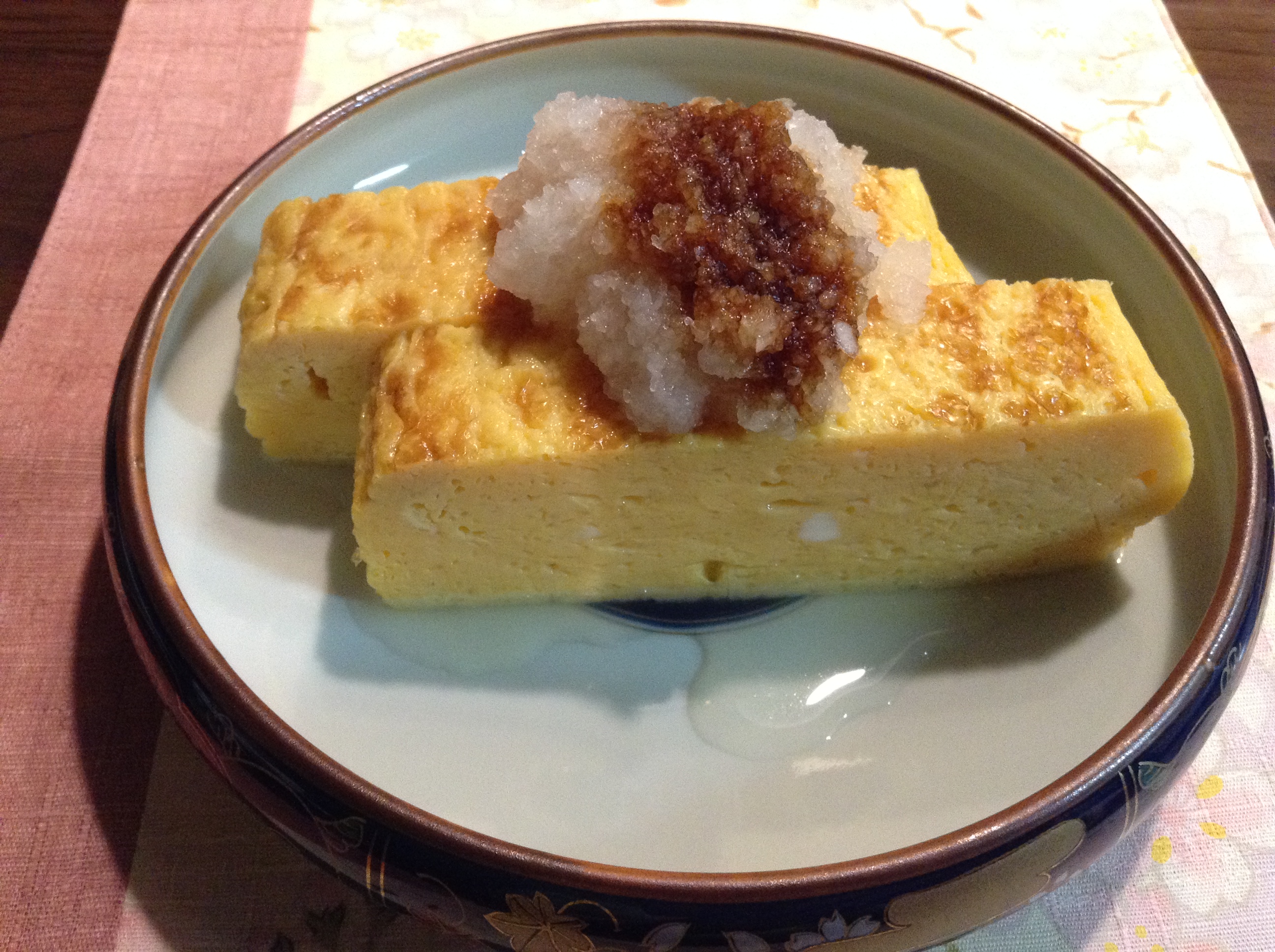 The tamagoyaki is on the sweet side, hence the name tamagoyaki. In Kyoto where the savory version is more popular, it is called dashimaki-tamago. At home we make the dashimaki version about once a week, so the sweet style from Marutake was a nice treat. And, has it is sweet, it calls out for something to balance the flavor. We grated some daikon which had a tinge of bitterness to it and topped it with some soy sauce. The perfect side dish for any Japanese meal, breakfast, lunch, or dinner. All the better with a glass of saké.