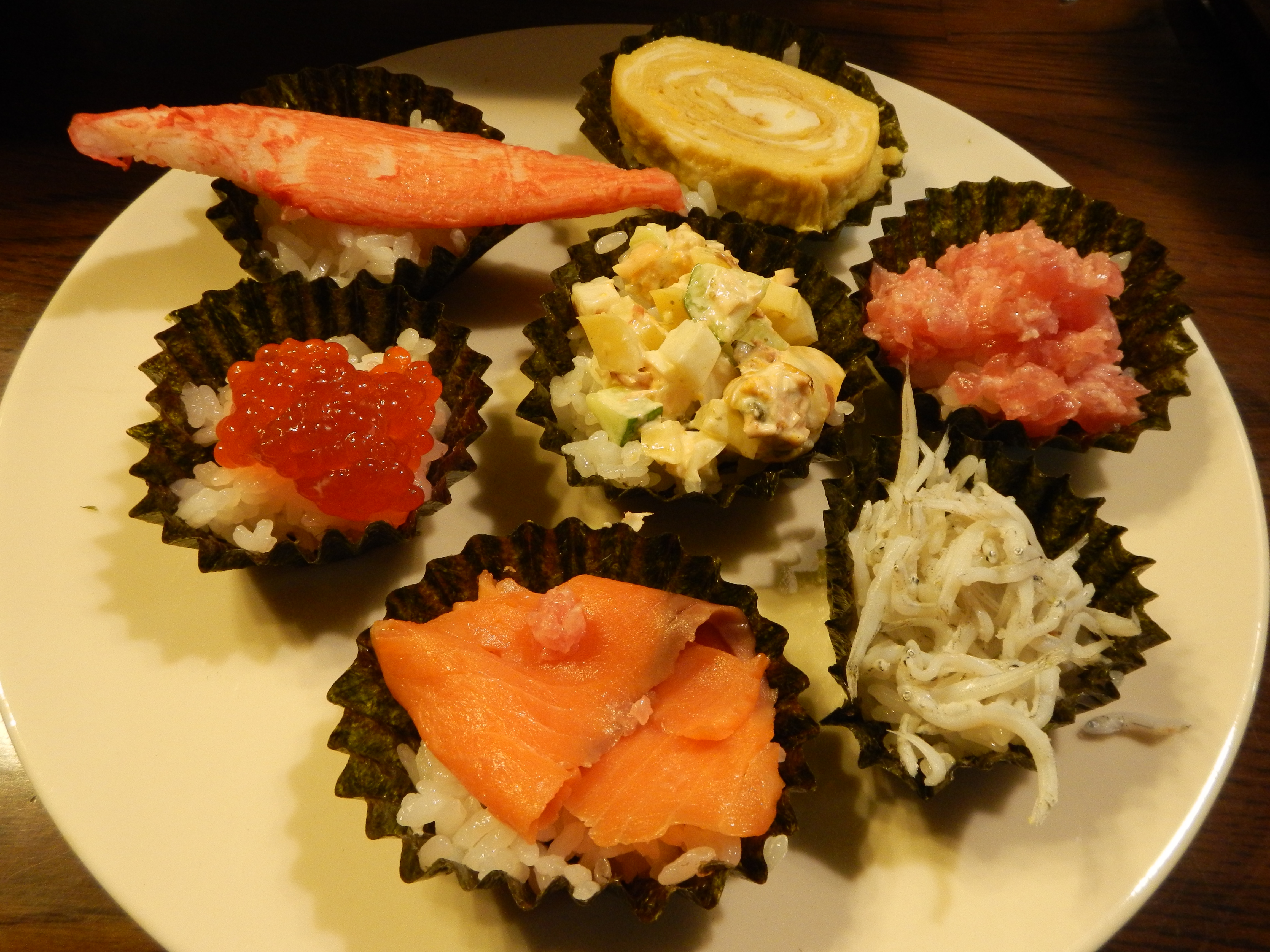 The first time we tried these we were celebrating a special occasion at home and Shinji pulled out all of the stops. Topping options this night included: clockwise from top left: sujiko (soy sauce marinated salmon roe in the sac), mentaiko (salted and spicy cod roe), kombu, seafood salad, maguro (tuna), kazunoko (herring roe), tobiko (flying fish roe), tuna salad, salmon, tamagoyaki (omelet), crab, and shirasu (baby anchovies boiled in salt water).