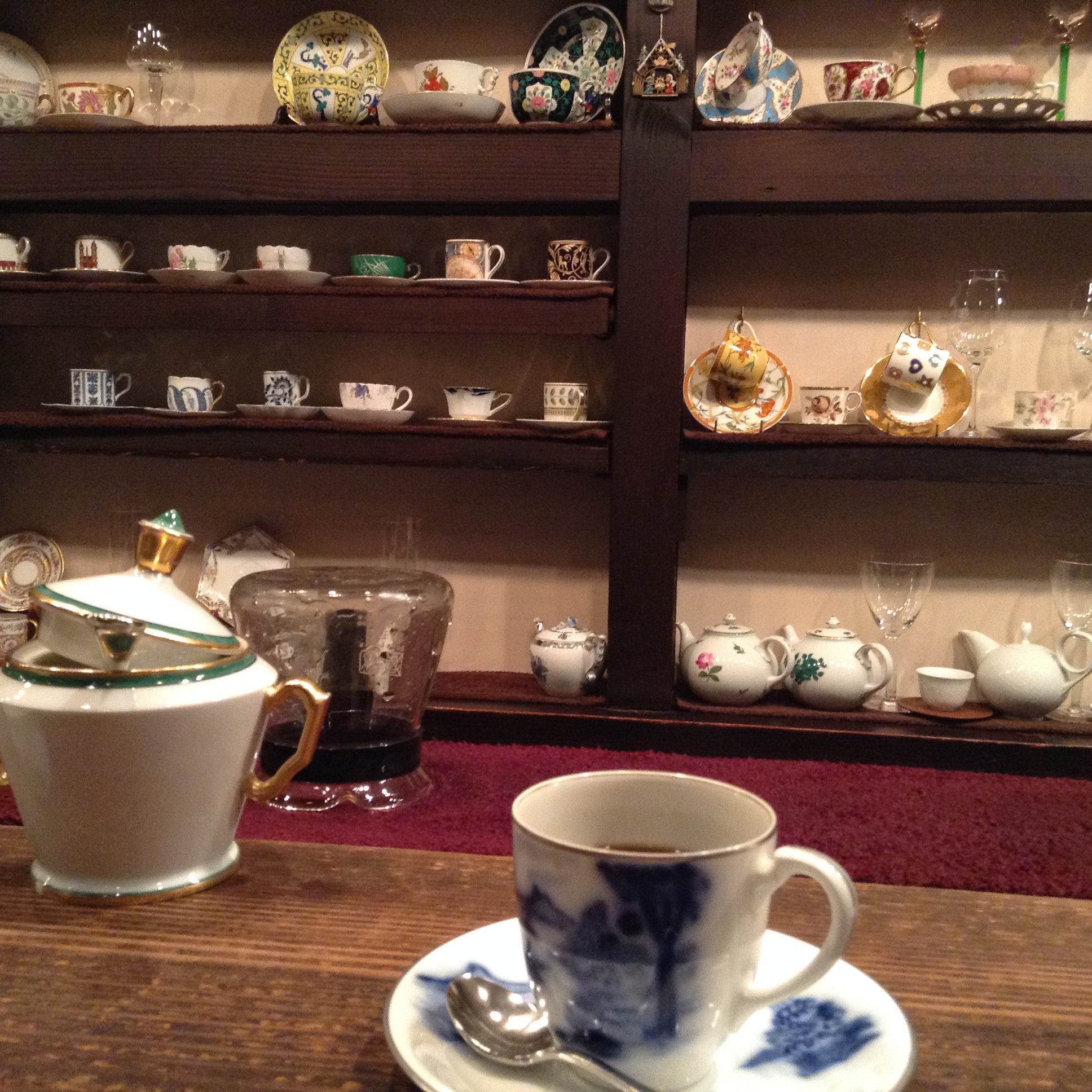 Just down a side street off of a major street and up a few meters from the Lacoste. The narrow shopfront sticks out on the street. It has charm and character and could have been modeled after a ski house in Europe. The interior is dark and there is a lot of bric-a-brac on the walls on tables. I am guessing accumulated over the years as it opened in 1989. Walking in I knew I was back in Japan as it did smell of tobacco smoke. Bummer, but it wasn’t too smoky and I had to try what my friend said was one of the best coffees in the city.