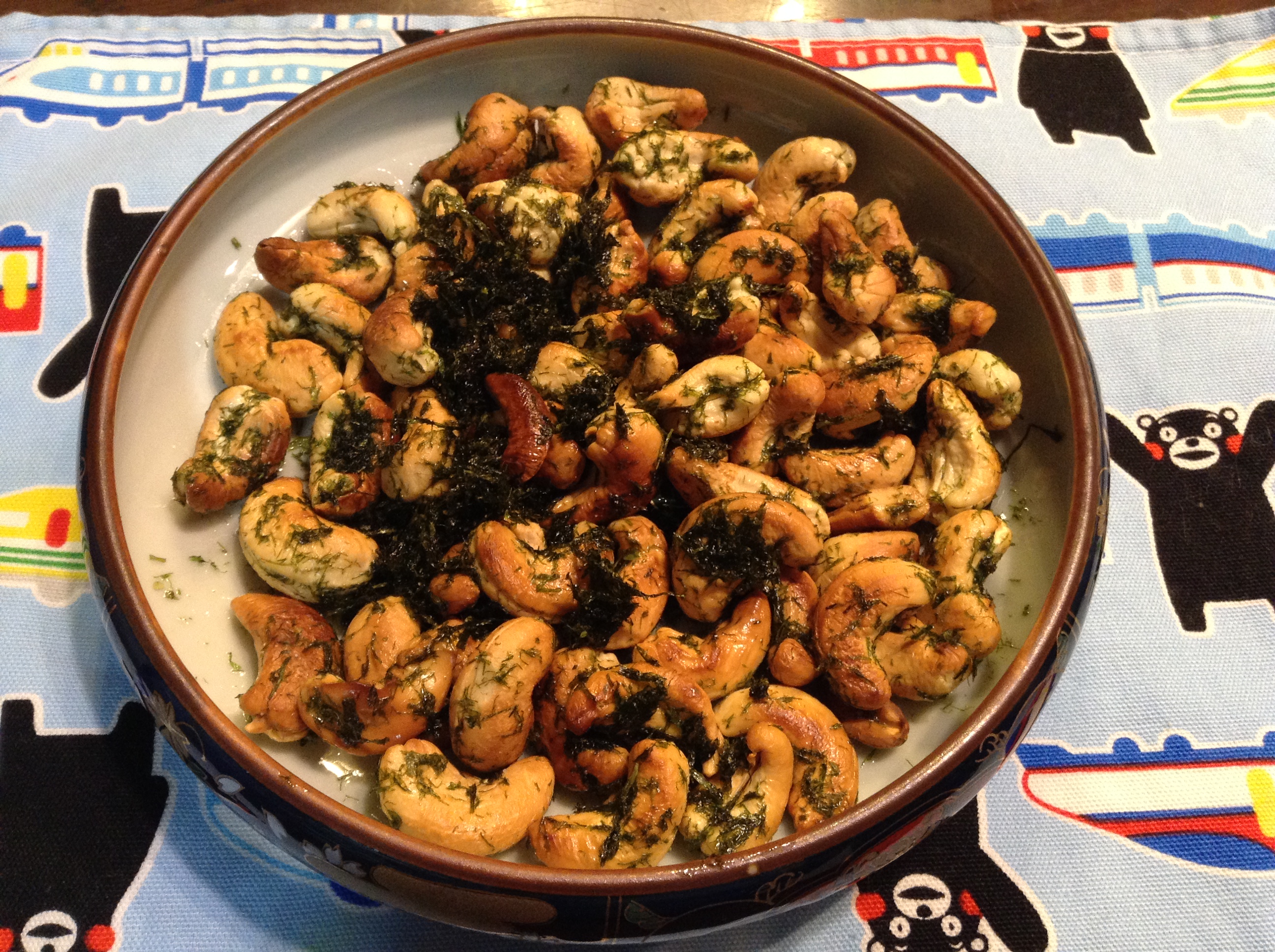 This is a simple dish to whip together. Take some raw nuts, fry in oil at low heat. Take the nuts out of the oil and then I quickly fry the aonori in the oil and then add to the nuts and season with salt. This dish above is with cashew nuts.