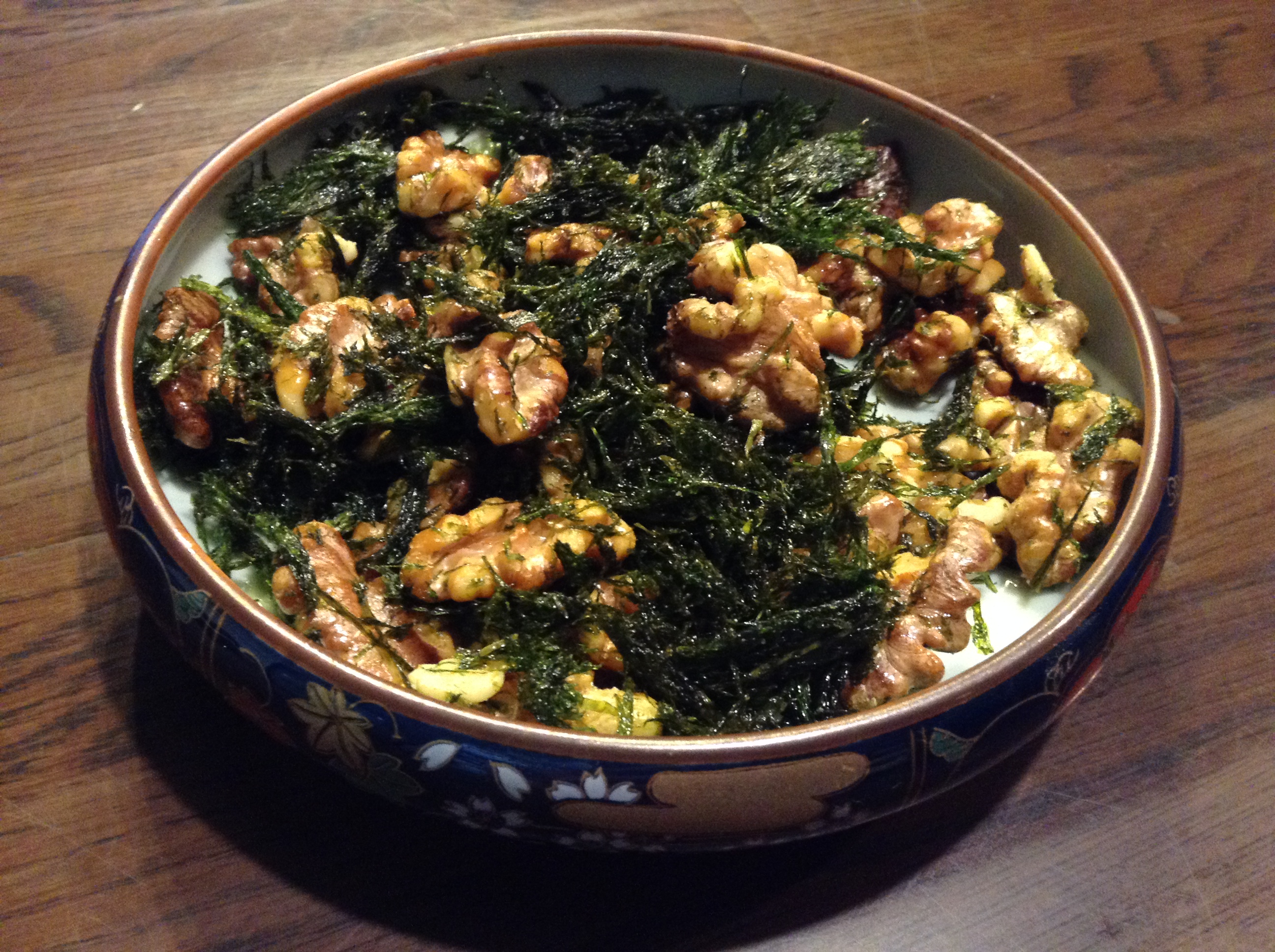 Nuts and sea vegetables are a new snack for me. The idea was introduced to me by chef friend of mine. My friend was in Tokyo and while here she was on the hunt for a special type of aonori. We looked throughout Tsukiji Market and finally came across what she was looking for. She said she wanted to bring some home to make this dish with nuts.