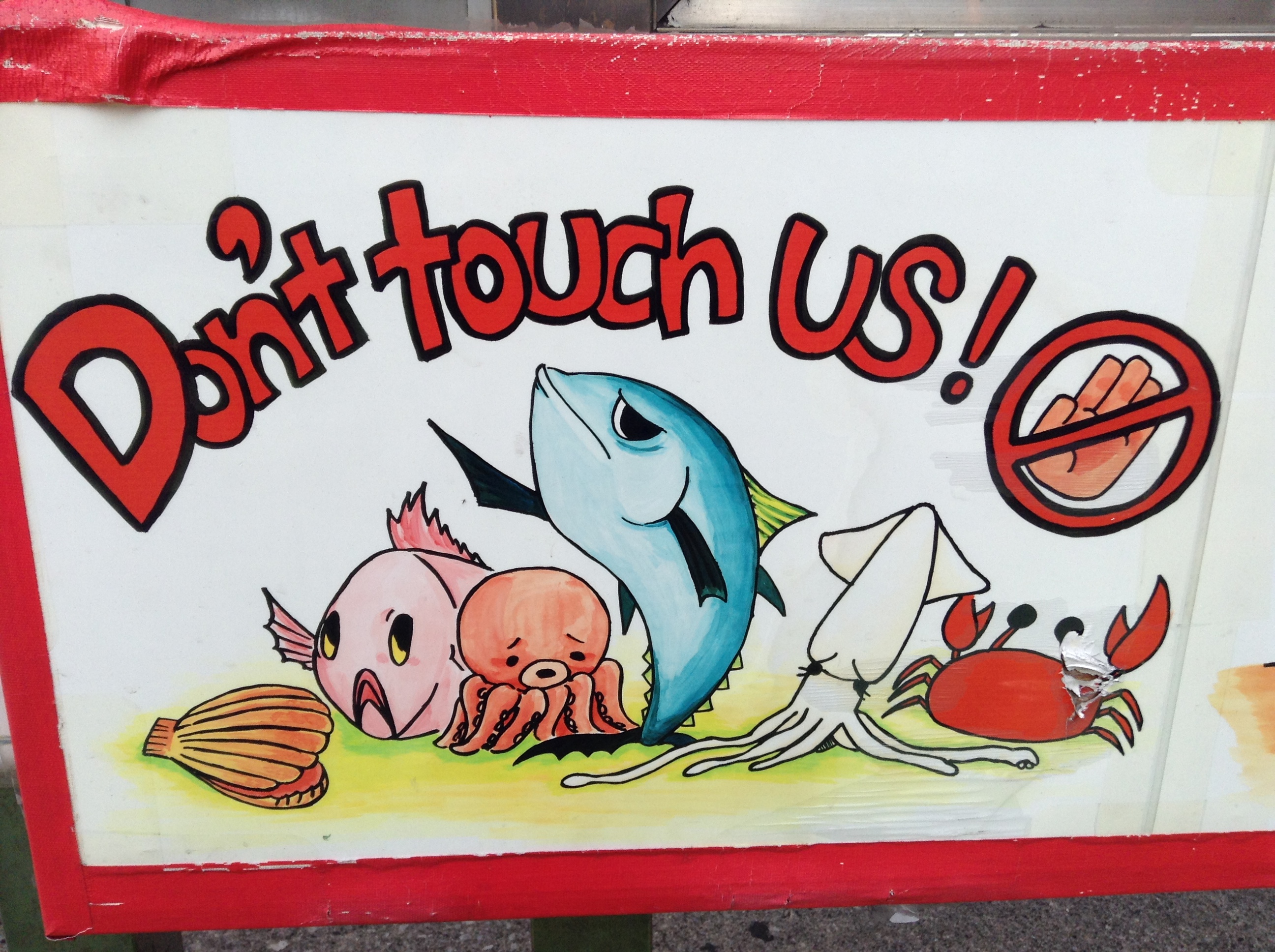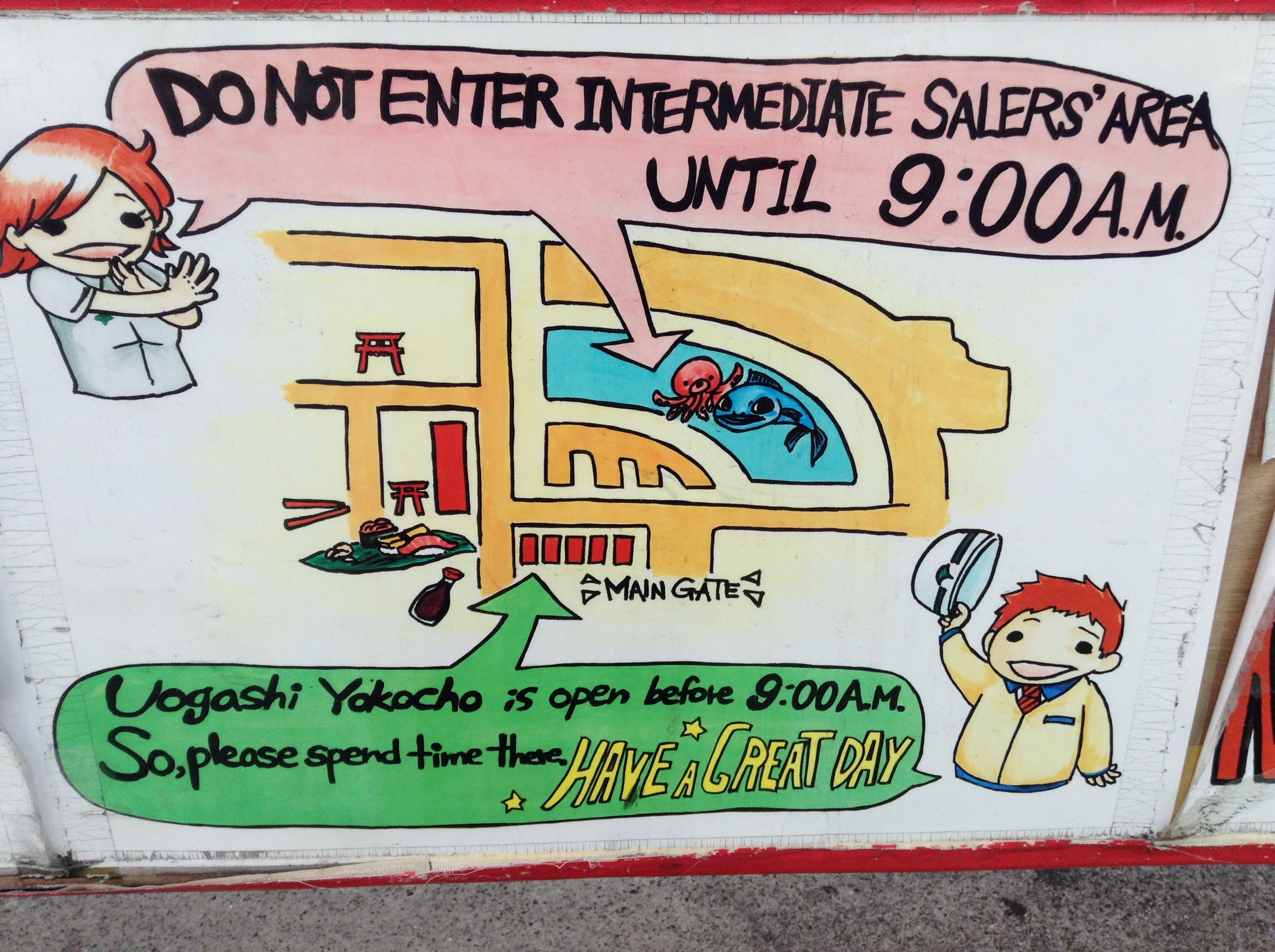 These signs are posted at one of the entry points to the inner market (jōnai) of Tsukiji Market. Some great tips here for visiting the inner market.