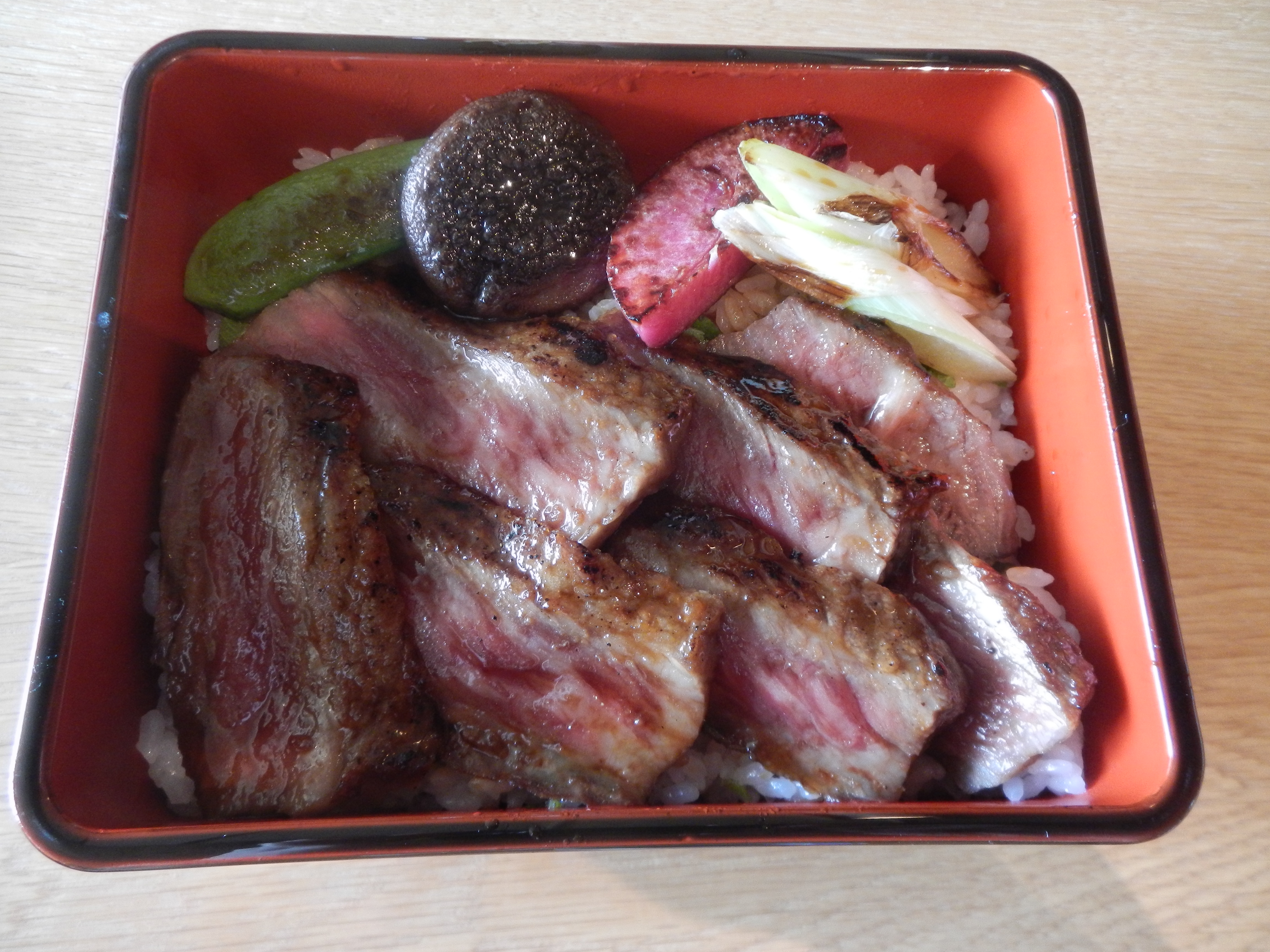 I dined with a girlfriend so we ordered two different menu items. This jyūbako, a square lacquer box of rice topped with seared wagyū sirloin steak as the main part of the kaiseki is 8,700 JPY. This comes with an appetizer, sashimi, miso soup, pickles, and dessert. The meat was marbled with fat but was not too rich. A great option for meat eaters.