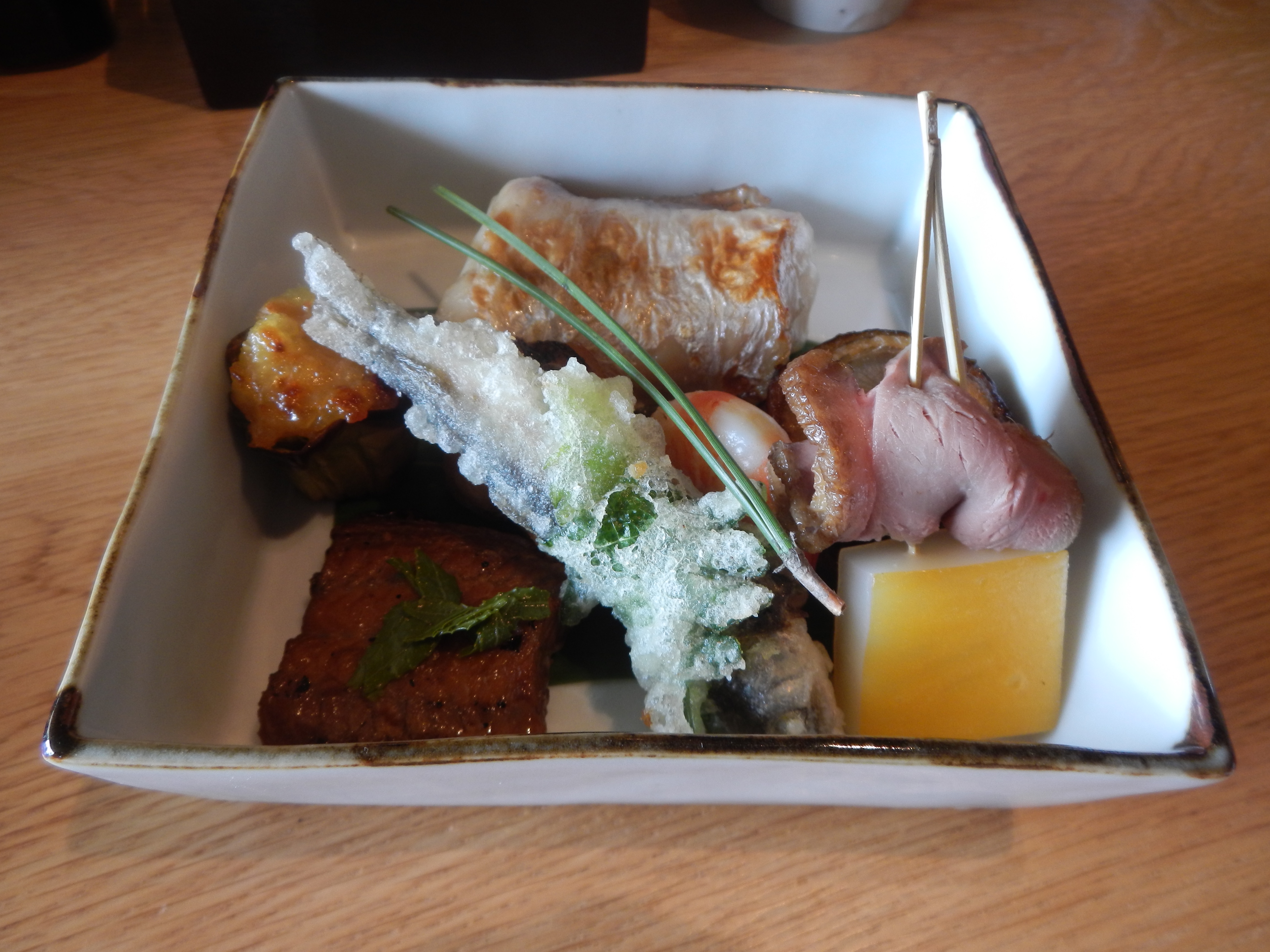 The three-tiered lunch box kaiseki set starts at 5,400 JPY. This is a lovely presentation with many courses served in one box. This is also served with rice, miso soup, pickles, and dessert. Following are some of the highlights of the Nodate bentō.