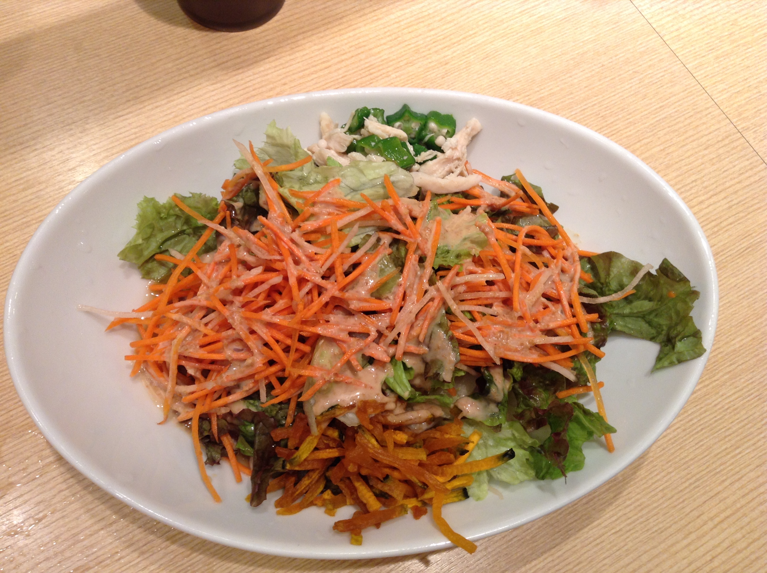 This year’s summer salad udon offers a full day’s of vegetables served over udon noodles for the bargain price of 500 JPY (about $5). The udon noodles are cooked and then quickly chilled in ice water and then topped with lettuce, carrots, daikon, deep-fried kabocha squash, okra, and some boiled chicken. Diners are offered the choice of a dressing, either creamy sesame or ginger. Here is a close-up photo on the company’s website. The other noodle bowls here are great, but the salad udon dish is one that I go back to often, especially in hot Japanese summers.