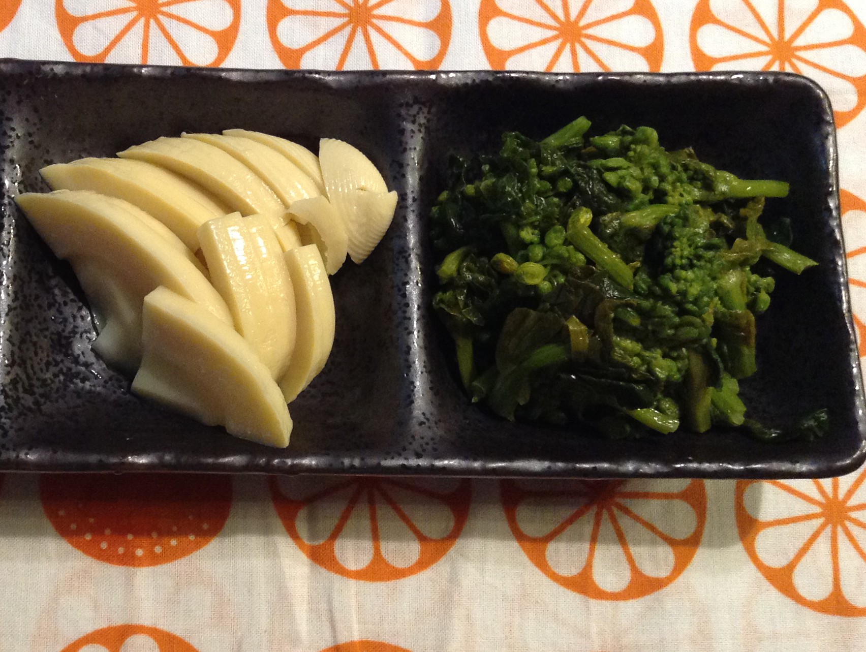 This spring we had bamboo shoots and nanohana (field mustard). The bamboo shoots were very tender and pickled in a light-colored soy sauce. The nanohana had a bit of a spicy bite to it.