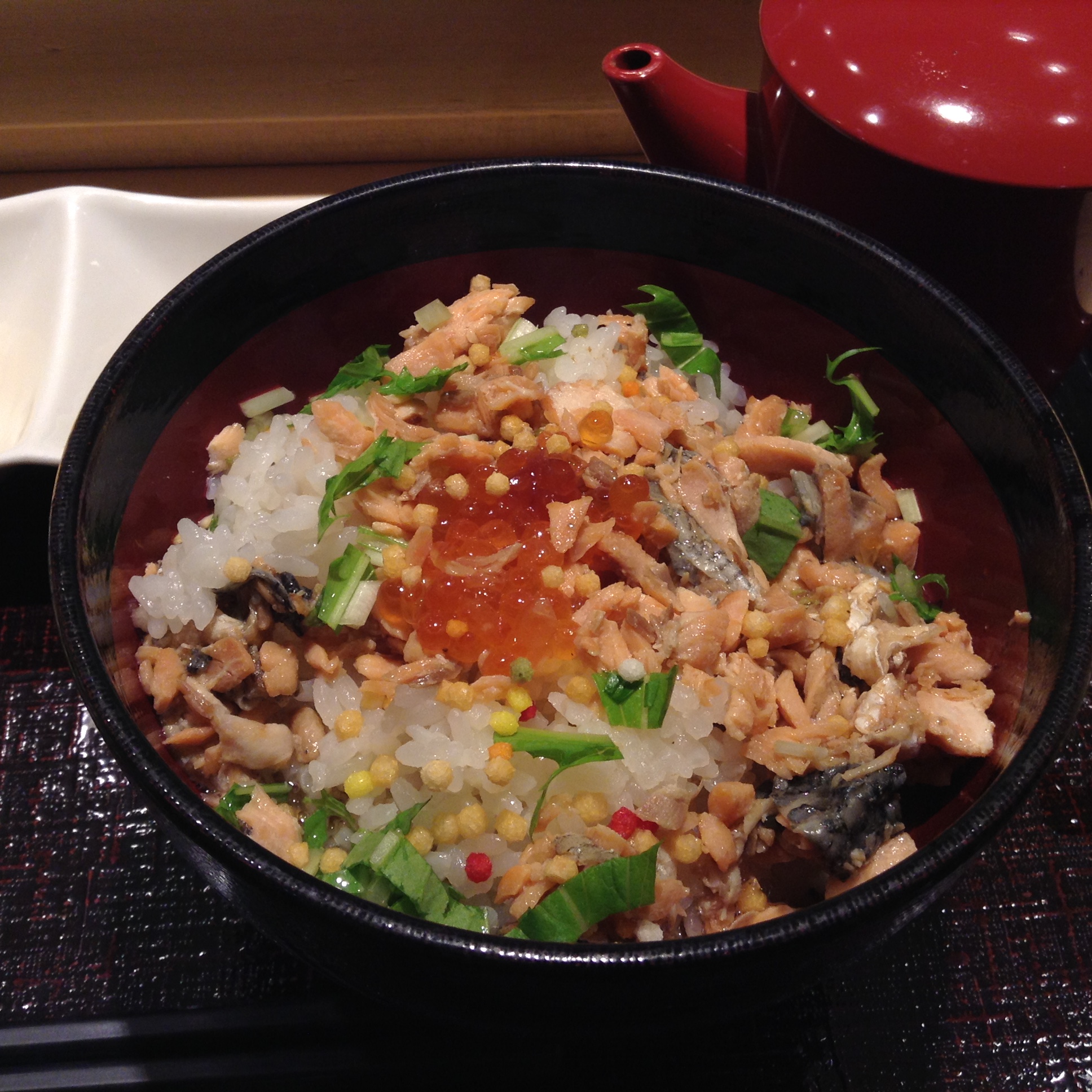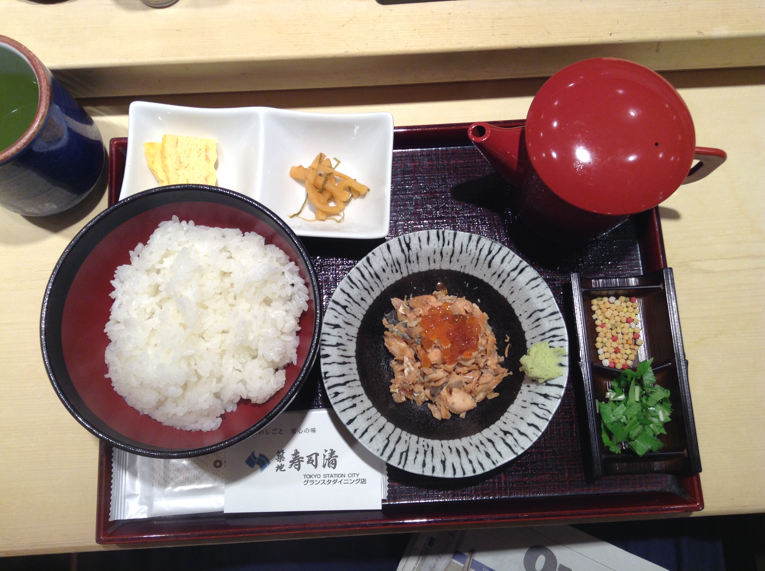 Sushi Sei is a popular sushi shop at Tsukiji Market that has a branch inside of Tokyo Station. There is often a line of salarymen outside of the shop before it opens at 7 a.m. The breakfast options include sashimi or donburi (sashimi over a large bowl of rice). There are also two versions of ochazuke. Ochazuke is a bowl of rice with toppings such as seafood or pickles that is then drenched with tea or a mix of dashi and tea. Sushi Sei has sea bream in a creamy sesame dressing or salmon belly with ikura. Above is the salmon and ikura set as it is presented.