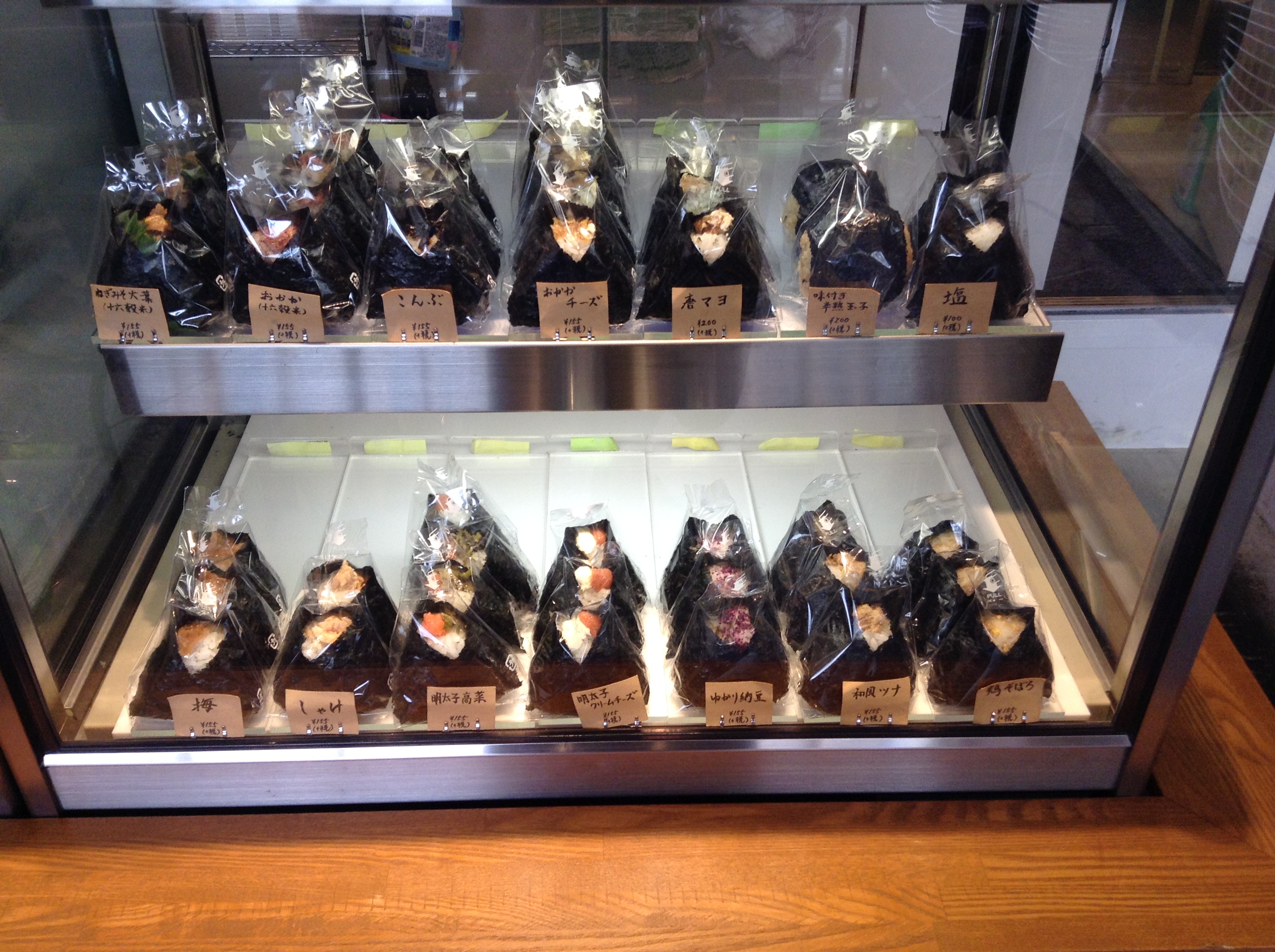 This is a great spot for vegetarians as there is a good selection of vegetable-only onigiri including yukari (salted red shiso) natto, leek miso with shiso, kombu, umeboshi, soft-boiled egg, and salt. There is also a selection of vegetable side dishes including potato salad, tomato salad, pickled cucumbers, and turnips with kombu.