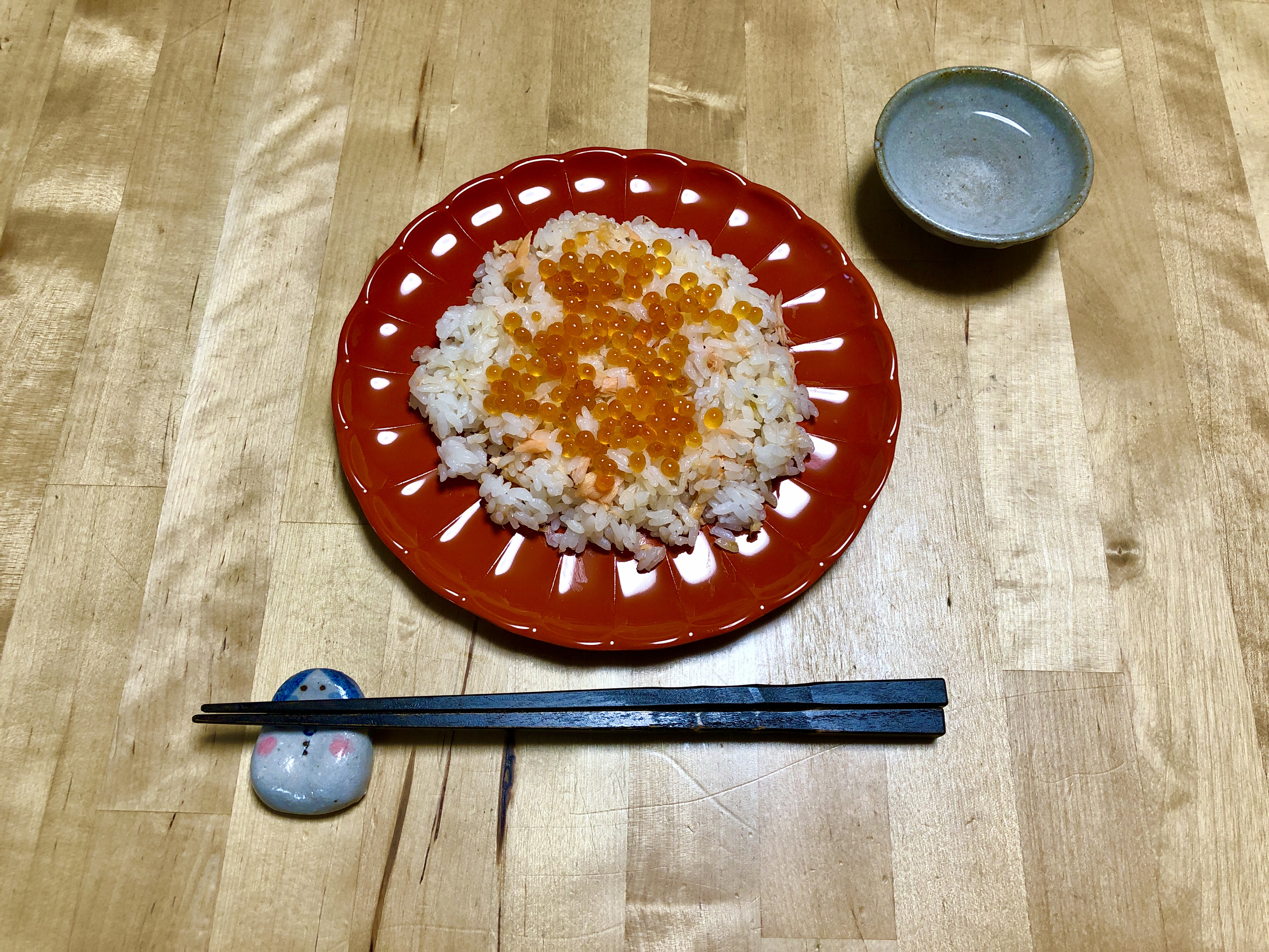 Grilled salmon (we use salted salmon filets) is added to the rice before it is cooked. Do not put in raw salmon as the flavors are better with cooked salmon. After the rice is steamed remove the bones and skin from the salmon and incorporate into the rice. Top with ikura.