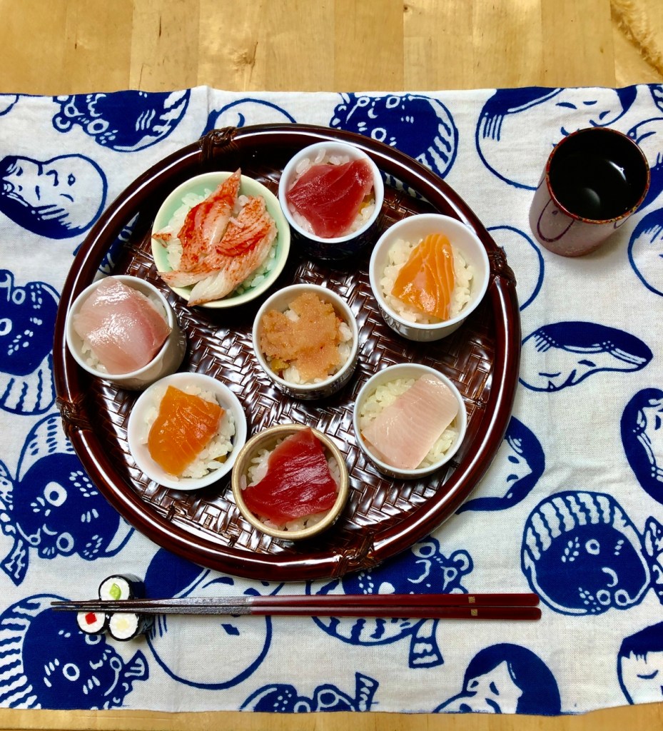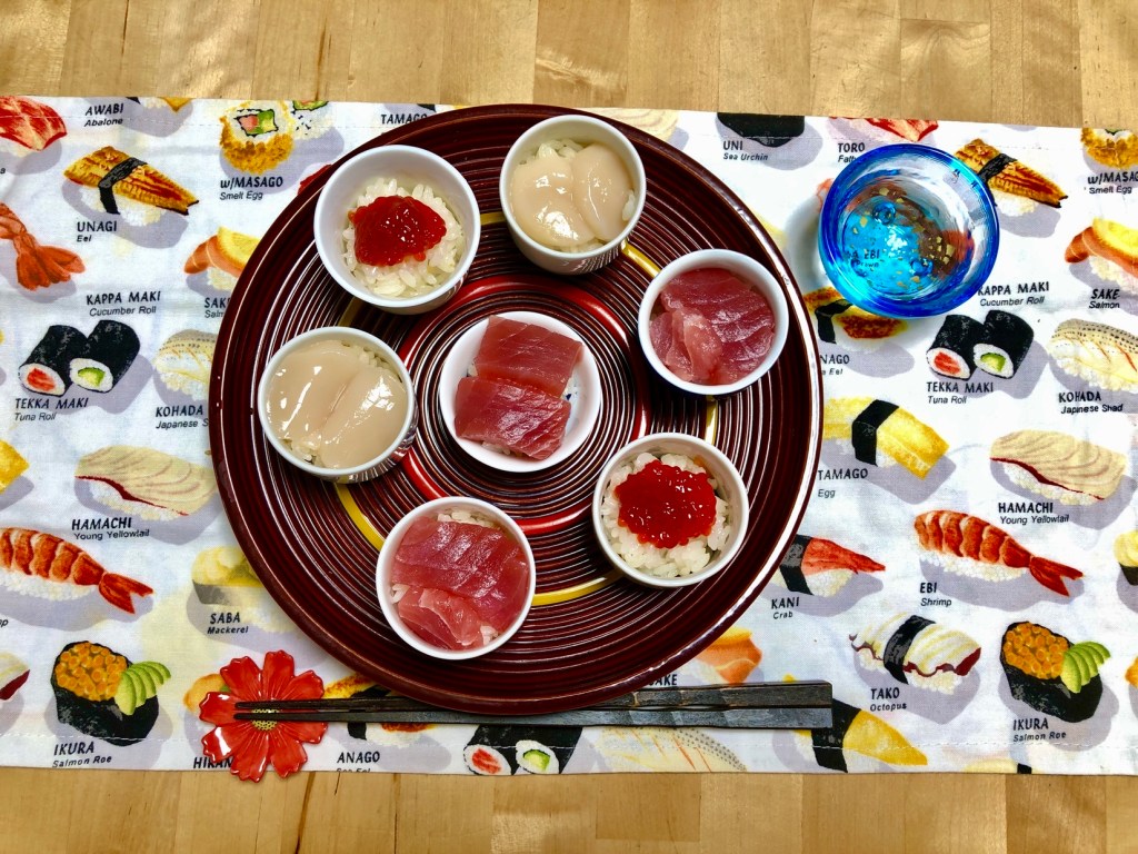 Simply put vinegared sushi rice in guinomi sake cups and top with sashimi, roe, kanikama imitation crab meat, and other sushi toppings.