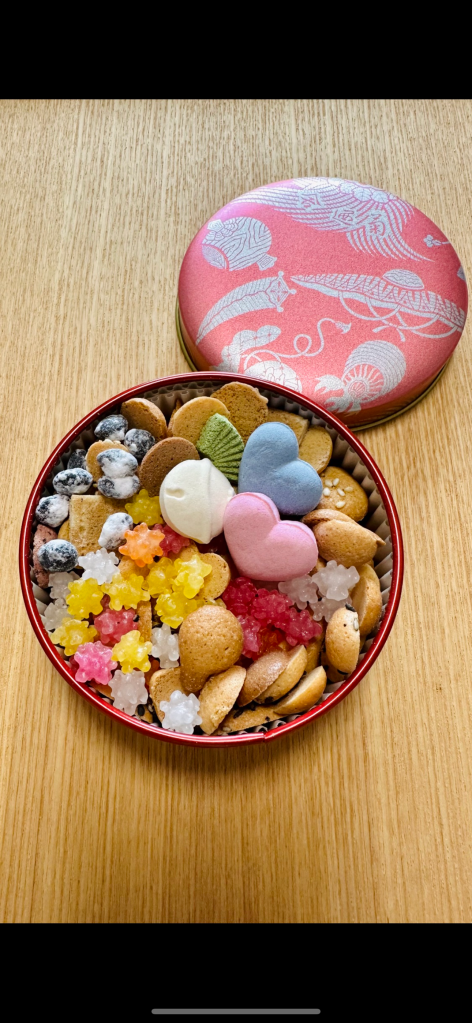 Kikunoya in Ginza came up with the idea of dry confectionaries for tea time and this colorful fukiyose was developed. Presented in colorful tins the sweets have a long shelf life and are a fun omiyage gift for friends. Opened in 1890 Kikunoya is a busy shop in the heart of Ginza (Ginza 5-9-17). The fukiyose tins start at 1,080 yen ($7.00 with the weak yen). And the tins can be repurposed to hold coins, stationary, a string of pearls. 🙂