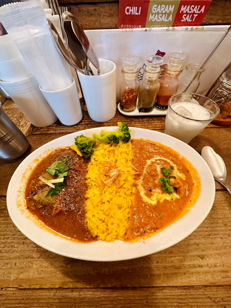 Rainbow Spice, just one minute from Tachikawa station’s South exit, is sliver of a shop. Seven counter seats overlooking an itsy-bitsy kitchen. Rainbow Spice makes the curries from scratch and doesn’t use flour but yogurt as a thickener.