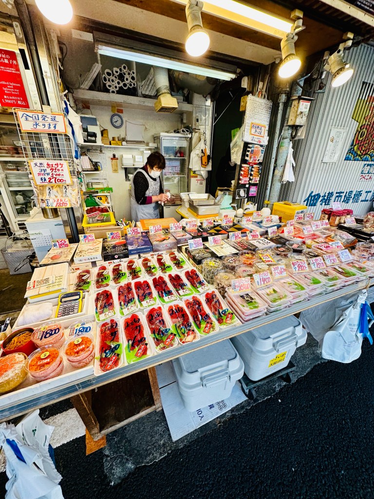Delicious start to the day at Tsukiji Tadokoro Shokuhin, a fish roe specialty shop. The eat-in counter has rice and pasta dishes with ikura (salmon roe), tarako and mentaiko (both from pollack roe). There is also onigiri or omusubi rice balls stuffed with roe for take-away.
