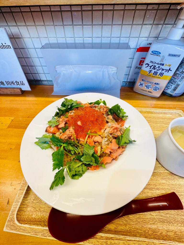 This is rice sauteed in butter and soy sauce with grilled salmon and ikura. The mitsuba greens brighten up the dish. A similar dish is made with pasta noodles which is also oishii delicious.
