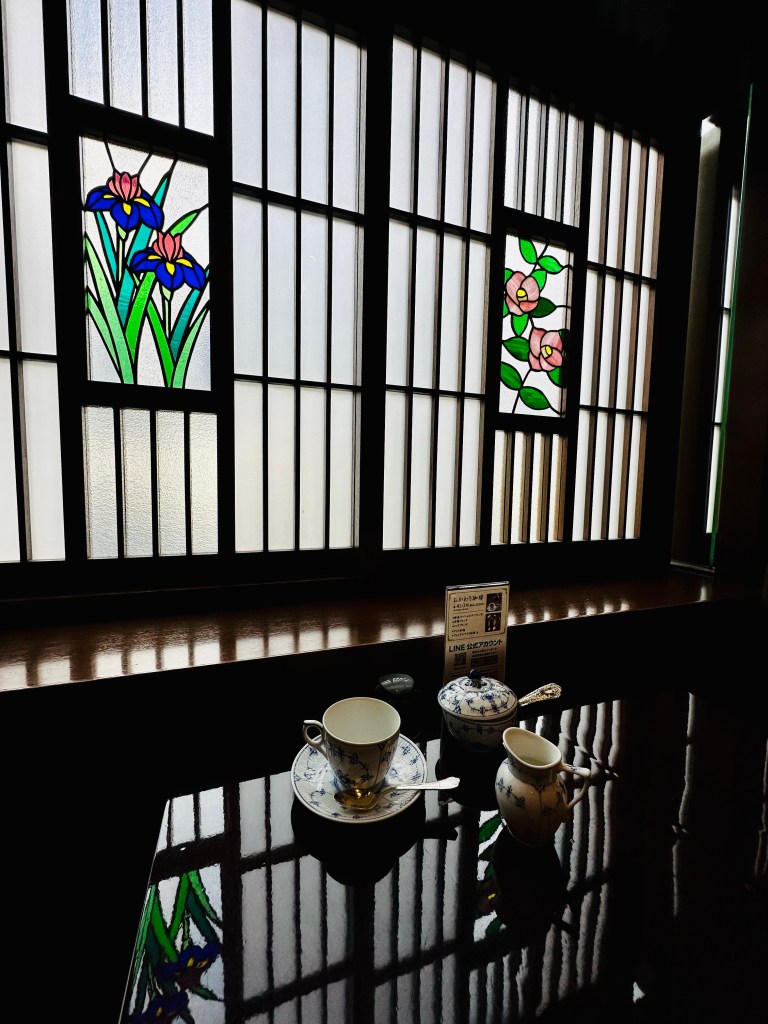 Tsubakiya reminded me of some of the mingei kissaten in Matsumoto – complete with dark wood interior, stained glass, and some dishes on display in glass cases. Waitresses wearing the French café uniform – black with white apron.
