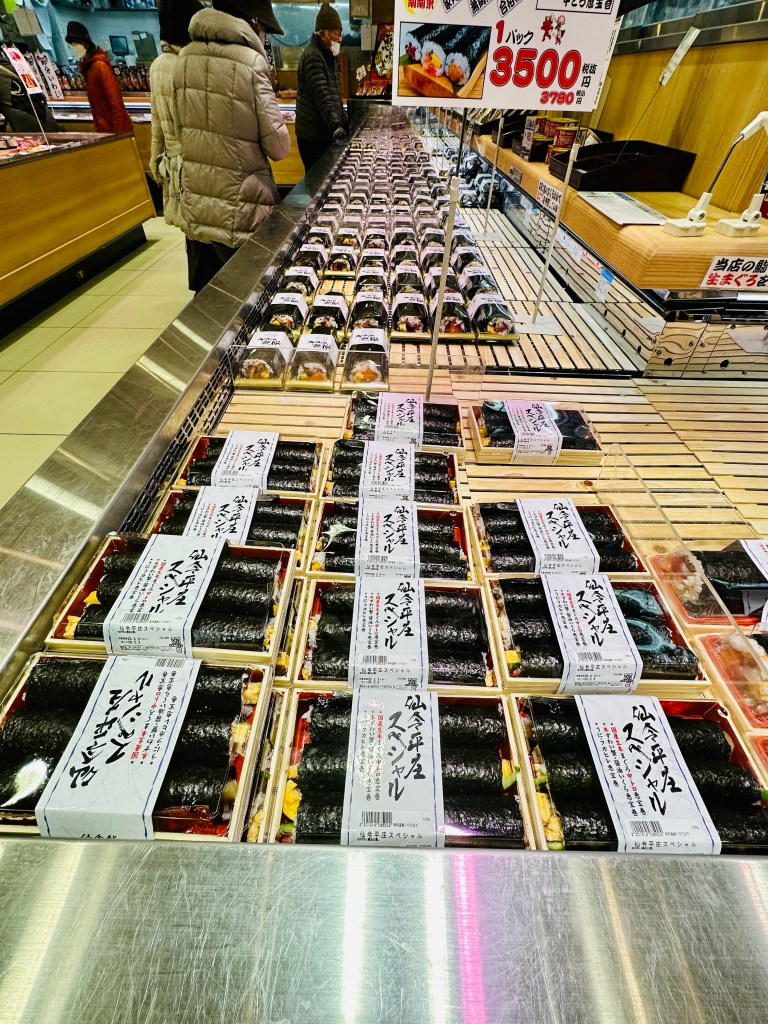 Today, February 3rd, is Setsubun in Japan. We start the day throwing dried soybeans saying out with the devil, in with good fortune. For dinner we made ehōmaki sushi rolls. The supermarkets are selling ehōmaki – lots of them.