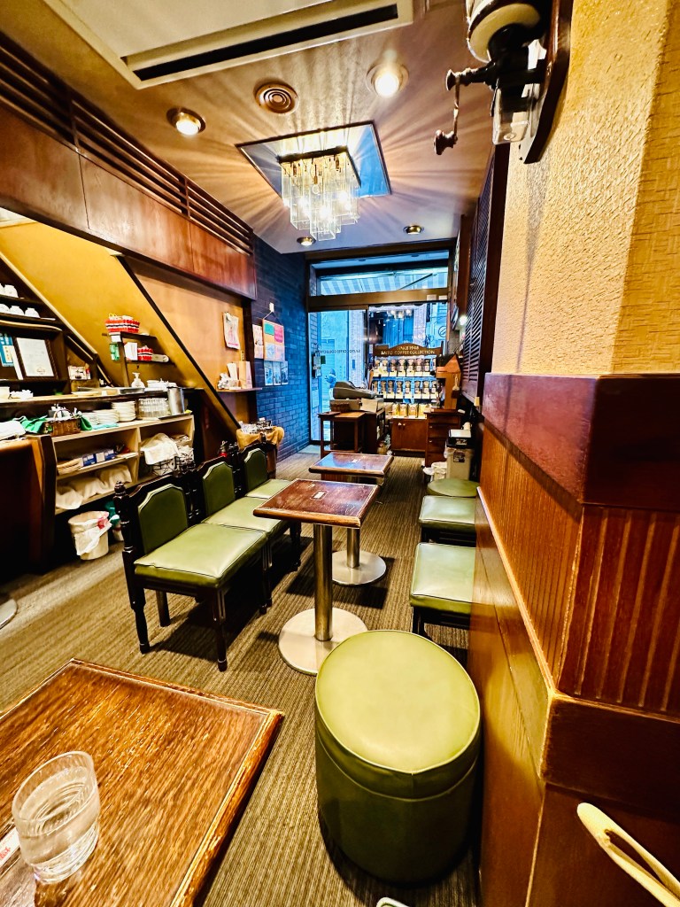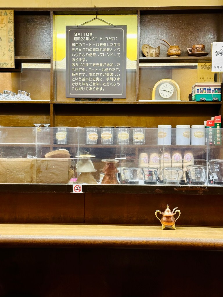 Saito’s Coffee has been in business since 1948 (Showa 23). On a quiet back street between Kanda Station and Mitsukoshi department store. Before work the kissaten coffee shop was quiet. Most of the customers walked in for a cup of hand drip coffee for a bargain 250 yen ($1.90).