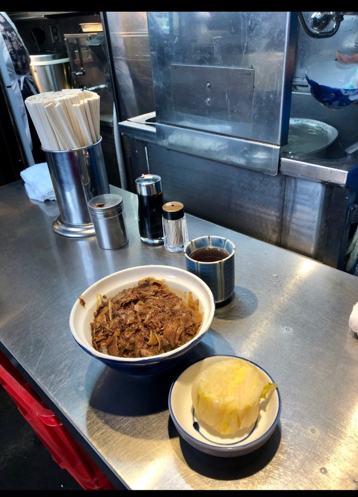 Kitsuneya at #Tsukiji Market is famous for offal (horumon in Japanese). The sliver of a shop also has a delicious #gyūdon, #beef #donburi #rice bowl. Napa cabbage #tsukemono pickles rounds out the meal. The leaves are squeezed into a tight bundle. Sprinkle with shichimi seven spice. Peel away the cabbage in layers.