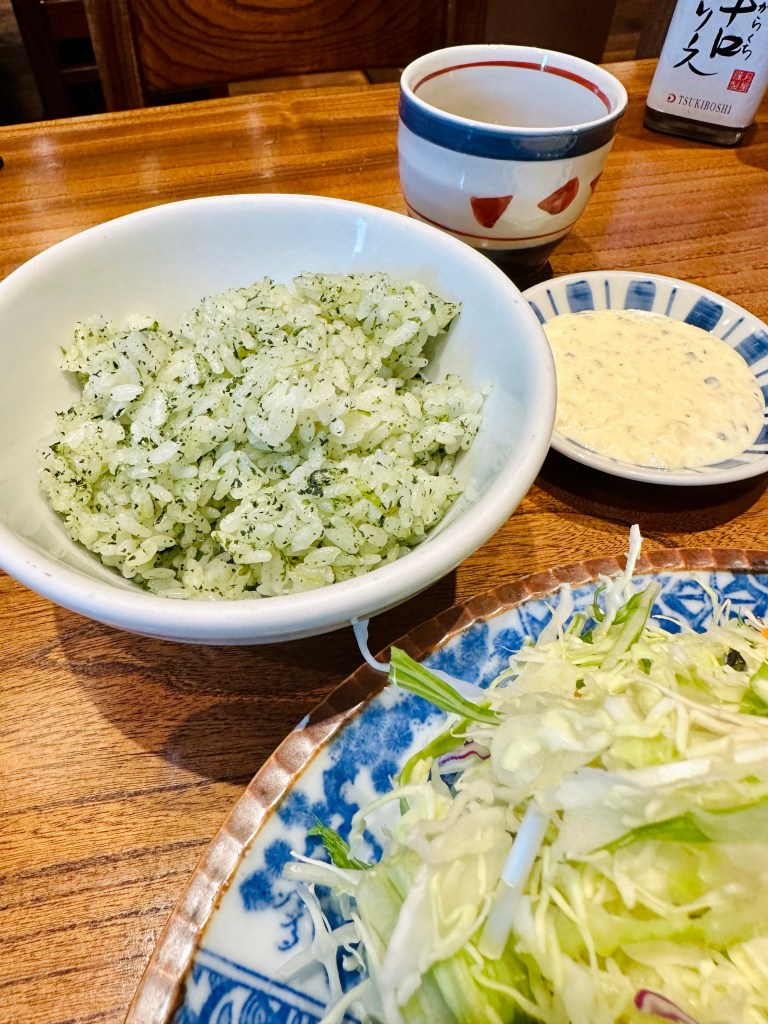 I also love Katsukichi because diners can select white rice or shiso rice. Fresh shiso is minced and mixed into the rice. I sometimes make it at home now, because of Katsukichi.