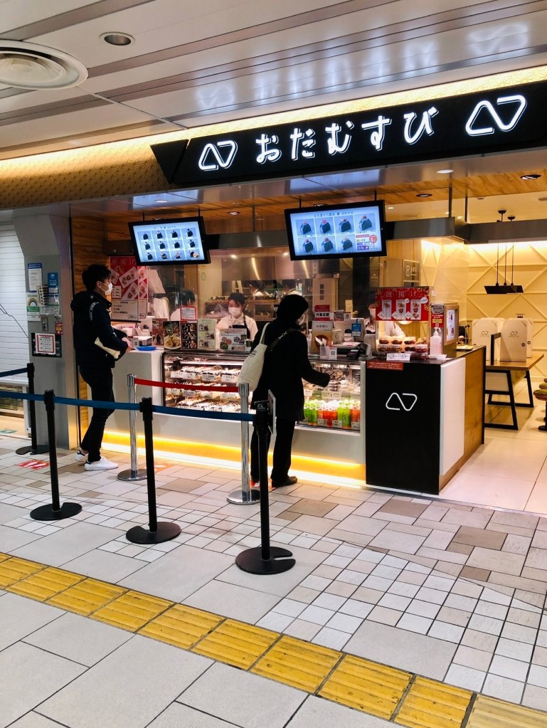 Onigiri breakfast at Shinjuku station. Odamusubi is part of Odakyu department store. Diners have a selection of onigiri filled with tart umeboshi, pickled takana greens, spicy mentaiko cod roe, and more.