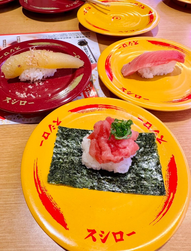 Sushiro is our local kaitenzushi, conveyor belt sushi shop. It’s a fun sushi meal that starts at about $1 per plate (often with two sushi). The color of the plate determines the price. At the end of the meal staff will count up how many plates are on the table.