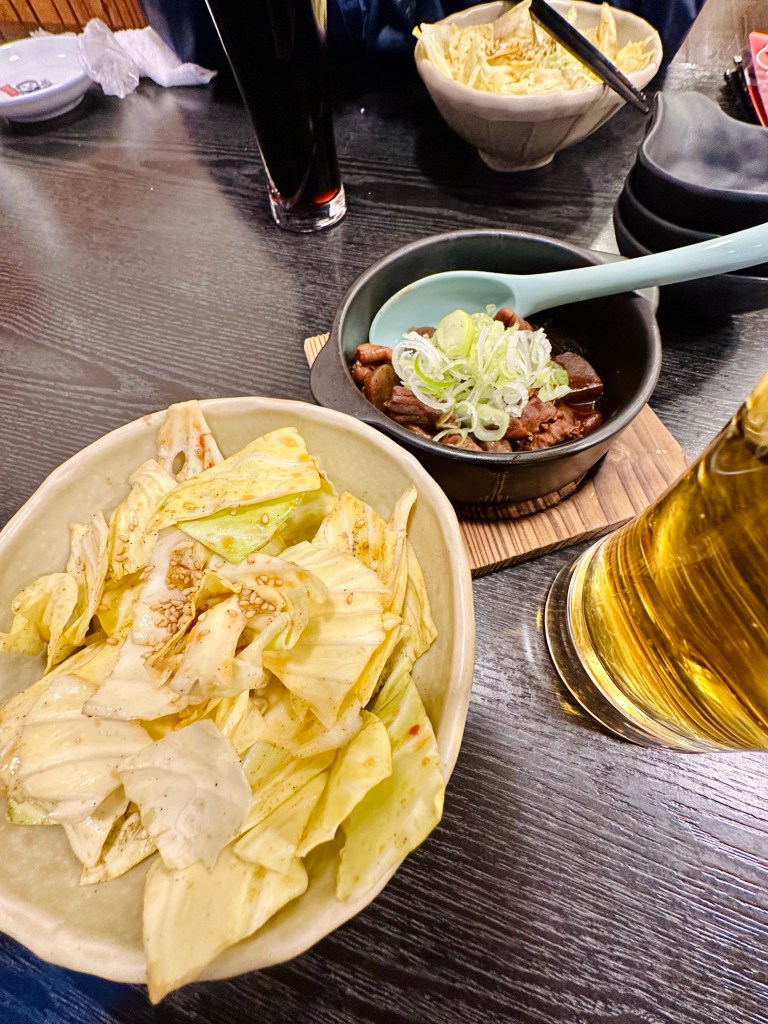 Potato salad and karaagé fried chicken are classic izakaya dishes. So is raw cabbage, sometimes with a miso dipping sauce or here with an umami sesame dressing.